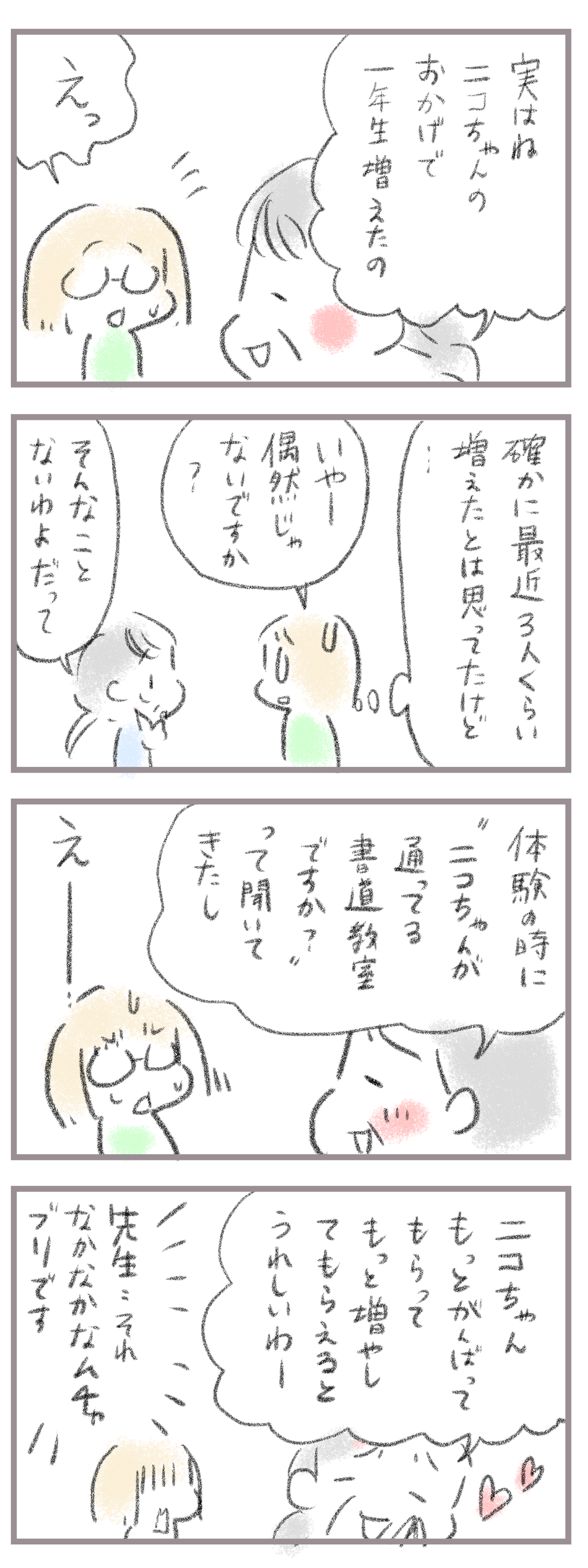次女、まさかの書道教室効果〜後編 2024年07月24日 きてくださってありがとうございます。9歳(小4)イチカと7歳(小1)ニコ、姉妹の母です。今回も前回の続きで次女の書道のお話です。前のお話↓ 最近増えたな〜と思った1年生。まさかの次女が広告塔になってたらしい…ありがたいやらですが…そんなに集客力ないのでこれ以 ... 続きを読む きてくださってありがとうございます。9歳(小4)イチカと7歳(小1)ニコ、姉妹の母です。今回も前回の続きで次女の書道のお話です。前のお話↓ 最近増えたな〜と思った1年生。まさかの次女が広告塔になってたらしい…ありがたいやらですが…そんなに集客力ないのでこれ以上増やすのは無理かと思われます^^;ただ2年間嫌々ながらも頑張った成果は見えてありがたいお話でした。____________________姉妹ピアノインスタ作りました!長女のピアノ↓ 事情によりお子さんがピアノをやっている方のみの閲覧に変更しました次女のピアノ↓こちらはみなさん閲覧できる状態にしてます。あたらしい記事がアップされるとお知らせが届きます↓ ランキングに参加中よかったら一日一 回ぽちお願いします。にほんブログ村 タグ :#書道#まさかの広告塔