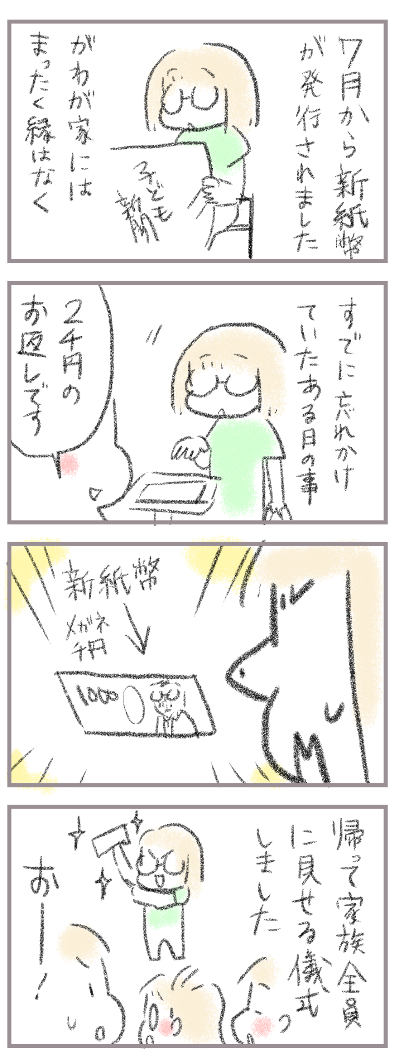 新札、ついにやってくる 2024年07月26日 きてくださってありがとうございます。9歳(小4)イチカと7歳(小1)ニコ、姉妹の母です。新札のことは出た当初はおー!となってましたが約2週間でほぼ忘れていたので急にくるとめっちゃびっくりしました。普通に出回ってきたけど家族で1番早く回ってきたのでちょっぴり嬉 ... 続きを読む きてくださってありがとうございます。9歳(小4)イチカと7歳(小1)ニコ、姉妹の母です。新札のことは出た当初はおー!となってましたが約2週間でほぼ忘れていたので急にくるとめっちゃびっくりしました。普通に出回ってきたけど家族で1番早く回ってきたのでちょっぴり嬉しかった話でした。皆さんの周りはどうでしょうか?____________________姉妹ピアノインスタ作りました!長女のピアノ↓ 事情によりお子さんがピアノをやっている方のみの閲覧に変更しました次女のピアノ↓こちらはみなさん閲覧できる状態にしてます。あたらしい記事がアップされるとお知らせが届きます↓ ランキングに参加中よかったら一日一 回ぽちお願いします。にほんブログ村 タグ :#新札#お釣りで出てきた
