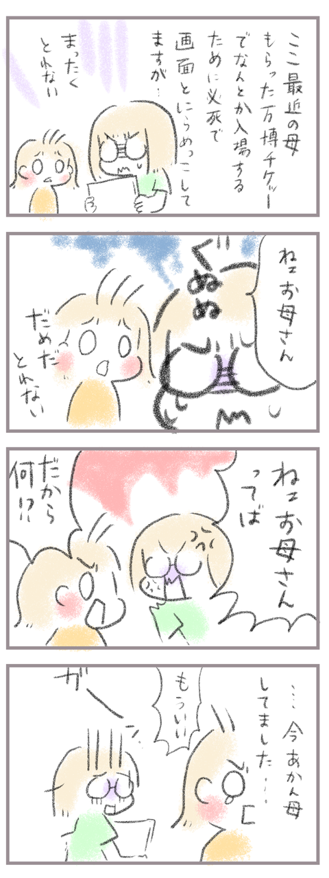 きてくださってありがとうございます。10歳(小5)イチカと8歳(小2)ニコ、姉妹の母です。もうすぐ閉幕の万博チケットもらった母、一生懸命入場予約しようとしてますが全然入れない罠に捕まってます。そのため必死に色々手を尽くしてますが…余裕がないとダメですね…締め切 ...