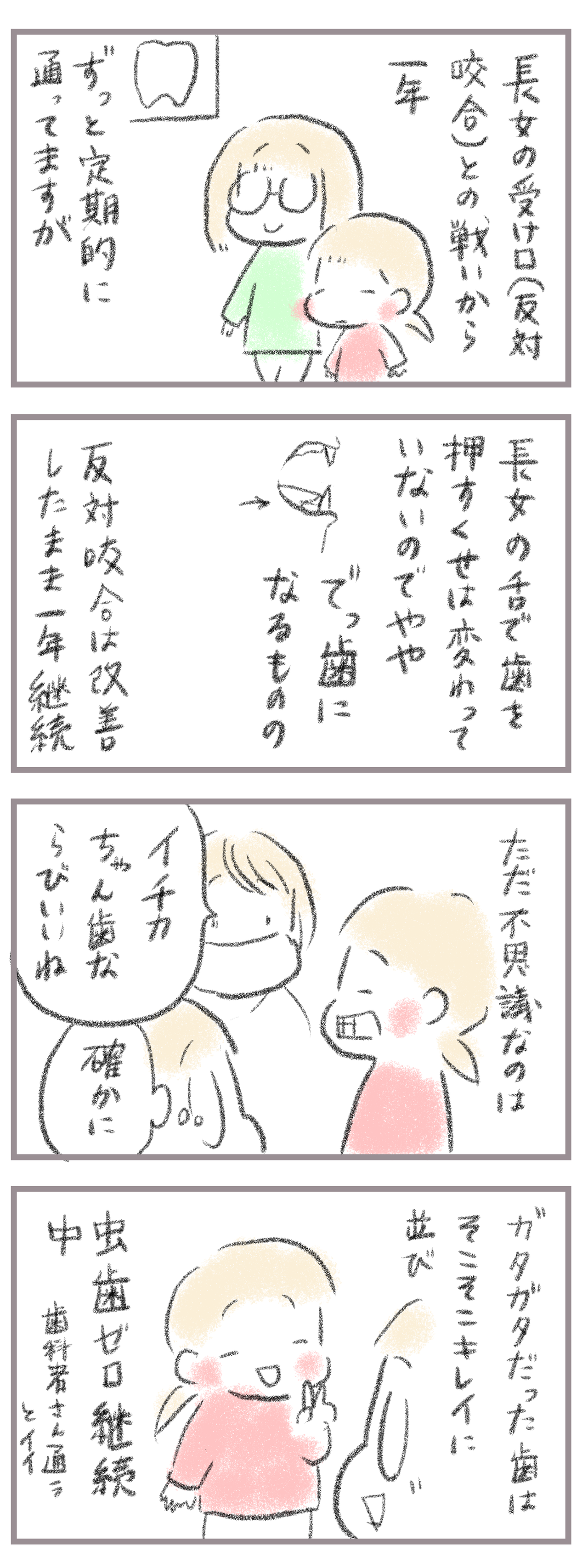 虫歯はゼロ、歯並びも若干良くなって来てます。