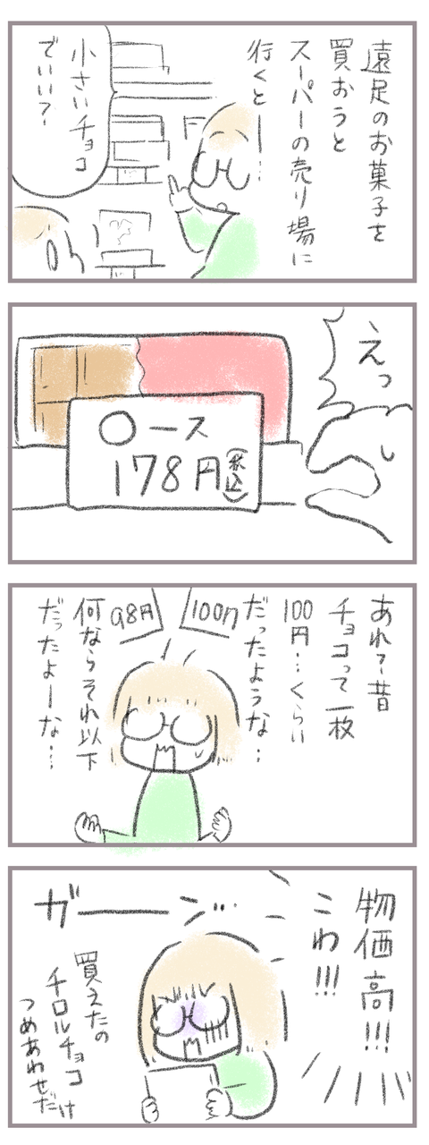 物価高…凹むくらい上がってた… 2025年11月23日 きてくださってありがとうございます。10歳(小5)イチカと8歳(小2)ニコ、姉妹の母です。100円のチョコを買おうとしたら100円以下が少なすぎる…!!衝撃でした。板チョコが178…す、すごい時代が来た…特にチョコレート高いですね…大袋178円の時代がそれの4分の1しか入っ ... 続きを読む きてくださってありがとうございます。10歳(小5)イチカと8歳(小2)ニコ、姉妹の母です。100円のチョコを買おうとしたら100円以下が少なすぎる…!!衝撃でした。板チョコが178…す、すごい時代が来た…特にチョコレート高いですね…大袋178円の時代がそれの4分の1しか入ってない…この10年で本当に値上がりが凄すぎる…インフレなのか…これからイベントごとが連続してるので戦々恐々です。今更かもしれないですが少額のものほどすごい差に衝撃を受けました…____________________姉妹ピアノインスタ作りました!長女のピアノ↓ 事情によりお子さんがピアノをやっている方のみの閲覧に変更しました次女のピアノ↓こちらはみなさん閲覧できる状態にしてます。あたらしい記事がアップされるとお知らせが届きます↓ ランキングに参加中よかったら一日一 回ぽちお願いします。にほんブログ村 タグ :#物価高#チョコレート高い