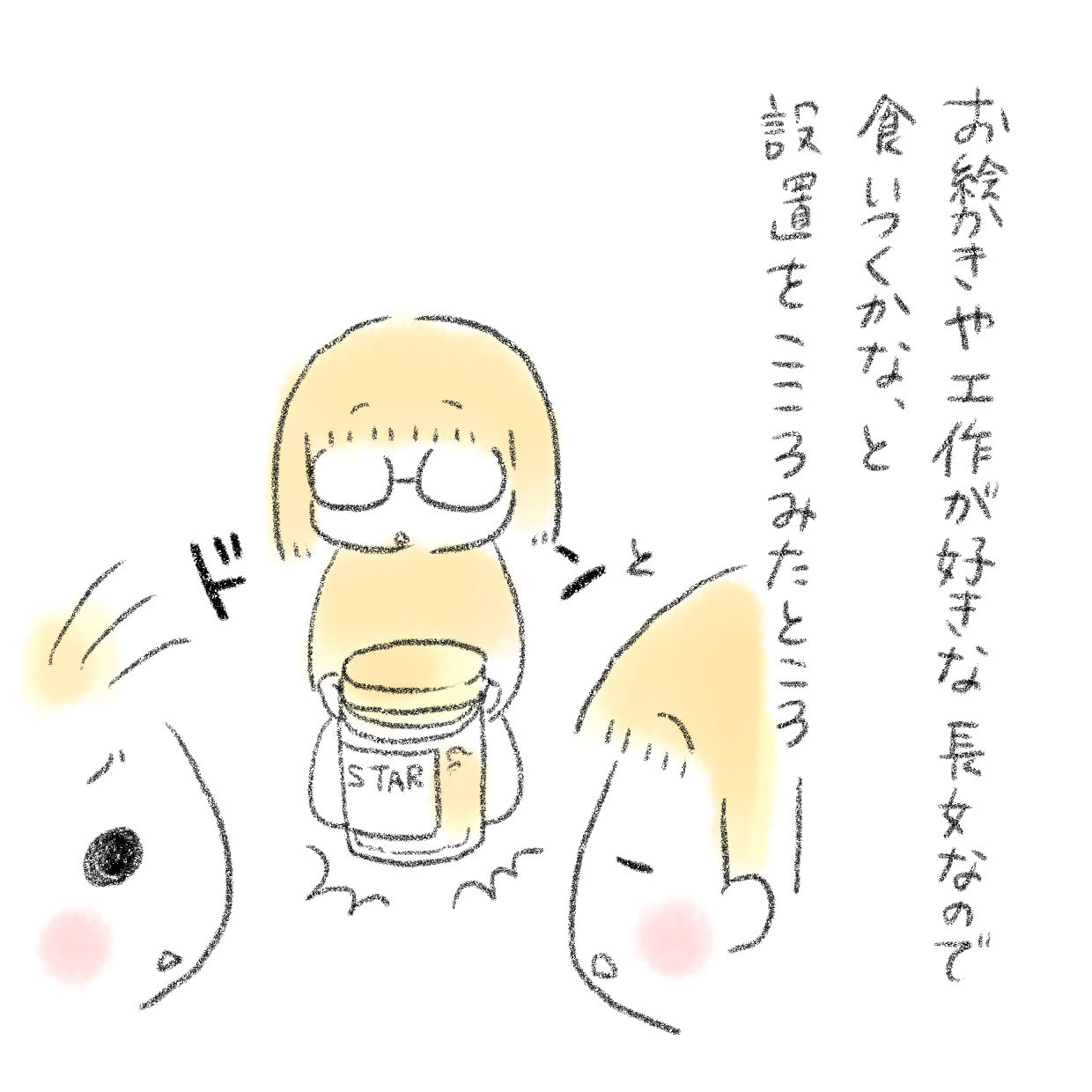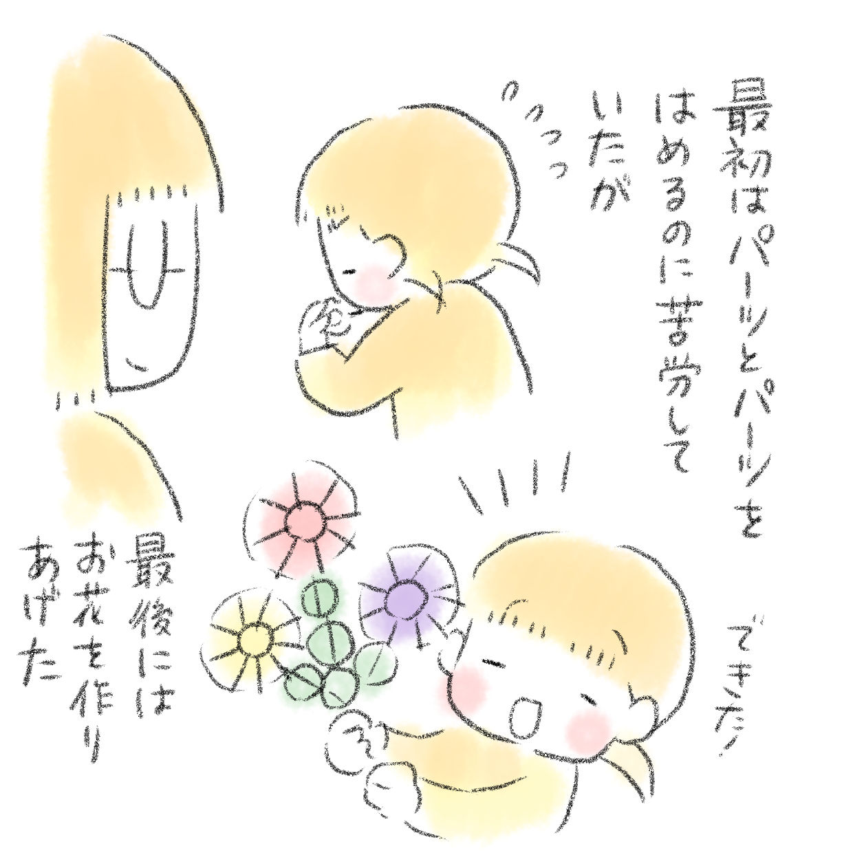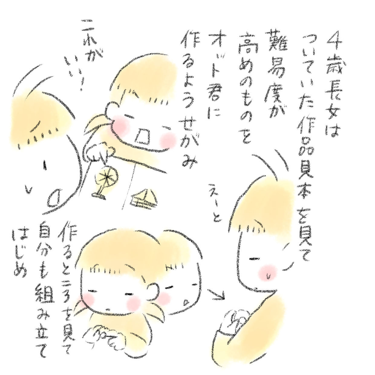 長女は見本のハートを見て早速自分も作り始め…