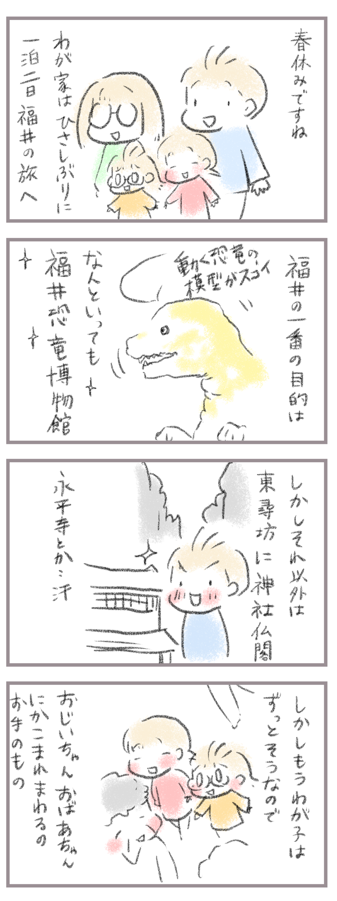 他の家族と違う我が家の旅行 2024年03月27日 きてくださってありがとうございます。9歳(小3)イチカと6歳(年長)ニコ、姉妹の母です。我が家の旅行は・家族が行きたいところを必ず入れる子どもメインではありません。そして必ずオットくんの趣味である神社仏閣を入れるのか恒例。今回は福井旅行に行きましたが子連れの ... 続きを読む きてくださってありがとうございます。9歳(小3)イチカと6歳(年長)ニコ、姉妹の母です。我が家の旅行は・家族が行きたいところを必ず入れる子どもメインではありません。そして必ずオットくんの趣味である神社仏閣を入れるのか恒例。今回は福井旅行に行きましたが子連れの王道、福井恐竜博物館は必ず入れて他は芝政ワールドあたりが子連れの王道かな?と思うんですが(こちら夏だったら入れたかも)気比神宮、永平寺が入りました。周りはみんな大人ばっかり。これが可哀想かどうかはさておき、おじいちゃんおばあちゃんに温かい目で見守っていただいて参拝させていただきました。旅行、どうして楽しいことはあっという間に終わってしまうのか…!そして感じたこと。物価高い(切実)みなさんも素敵な季節旅立たれる方は楽しんでください。我が家はあとは近所でまったり花見です____________________姉妹ピアノインスタ作りました!長女のピアノ↓ 事情によりお子さんがピアノをやっている方のみの閲覧に変更しました次女のピアノ↓こちらはみなさん閲覧できる状態にしてます。あたらしい記事がアップされるとお知らせが届きます↓ ランキングに参加中よかったら一日一 回ぽちお願いします。にほんブログ村 タグ :#福井旅行#子連れ#福井博物館