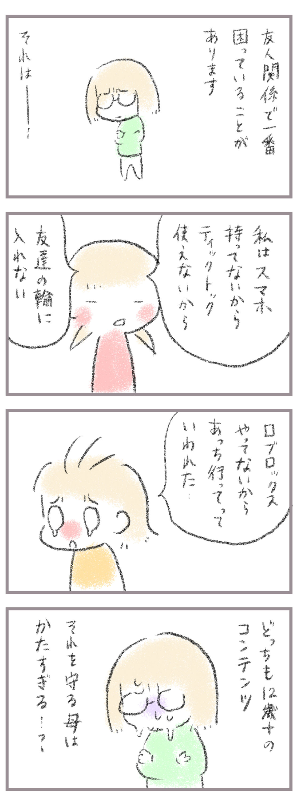 厳しすぎる?女子の仲間内の厳しいルールと葛藤 2026年01月14日 きてくださってありがとうございます。10歳(小5)イチカと8歳(小2)ニコ、姉妹の母です。いつの時代も女子関係は本当に難しく難解。仲間内で同じように動かないと行けないルールがあって同じものを持ってないと仲間外れ。親からしたら皆同じもの持ってるわけないだろ、とは ... 続きを読む きてくださってありがとうございます。10歳(小5)イチカと8歳(小2)ニコ、姉妹の母です。いつの時代も女子関係は本当に難しく難解。仲間内で同じように動かないと行けないルールがあって同じものを持ってないと仲間外れ。親からしたら皆同じもの持ってるわけないだろ、とは思うんですがやはり話の合う合わないはあるようで…姉妹が2人とも同じような理由で苦しんでます。両方年齢12+なんだよね…我が家は許可しません。これはどこまで行っても曲げません。子どもになんと言われようともこれはあかん。12になって逆に狂ったみたいにやり出したら上限決めて戦うしかないと覚悟してます。リスクが高すぎる。親って難しいですね…育児には本当答えはないなぁ…____________________姉妹ピアノインスタ作りました!長女のピアノ↓ 事情によりお子さんがピアノをやっている方のみの閲覧に変更しました次女のピアノ↓こちらはみなさん閲覧できる状態にしてます。あたらしい記事がアップされるとお知らせが届きます↓ ランキングに参加中よかったら一日一 回ぽちお願いします。にほんブログ村 タグ :#孤独の理由#周りと合わせないといけないと合わせないといけない現実