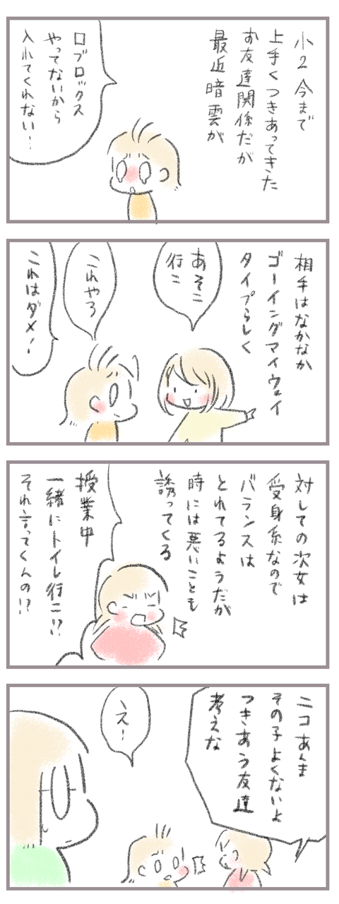妹の友人関係に物申す姉 2026年01月15日 きてくださってありがとうございます。10歳(小5)イチカと8歳(小2)ニコ、姉妹の母です。最近友人関係で悩んでいる姉妹。特に妹は初めてのようで…我が家の姉妹は性格がどちらかというと真逆。長女はさっくり言いたいことを言うストレート型。次女はあまり自分の意見を言わ ... 続きを読む きてくださってありがとうございます。10歳(小5)イチカと8歳(小2)ニコ、姉妹の母です。最近友人関係で悩んでいる姉妹。特に妹は初めてのようで…我が家の姉妹は性格がどちらかというと真逆。長女はさっくり言いたいことを言うストレート型。次女はあまり自分の意見を言わずに相手に従う内弁慶タイプ。そんな次女に姉が人生相談に乗ってました。次女もぼちぼち揉めまれる日々が来たんだなぁ…____________________姉妹ピアノインスタ作りました!長女のピアノ↓ 事情によりお子さんがピアノをやっている方のみの閲覧に変更しました次女のピアノ↓こちらはみなさん閲覧できる状態にしてます。あたらしい記事がアップされるとお知らせが届きます↓ ランキングに参加中よかったら一日一 回ぽちお願いします。にほんブログ村 タグ :#姉の人生相談#妹の友人関係