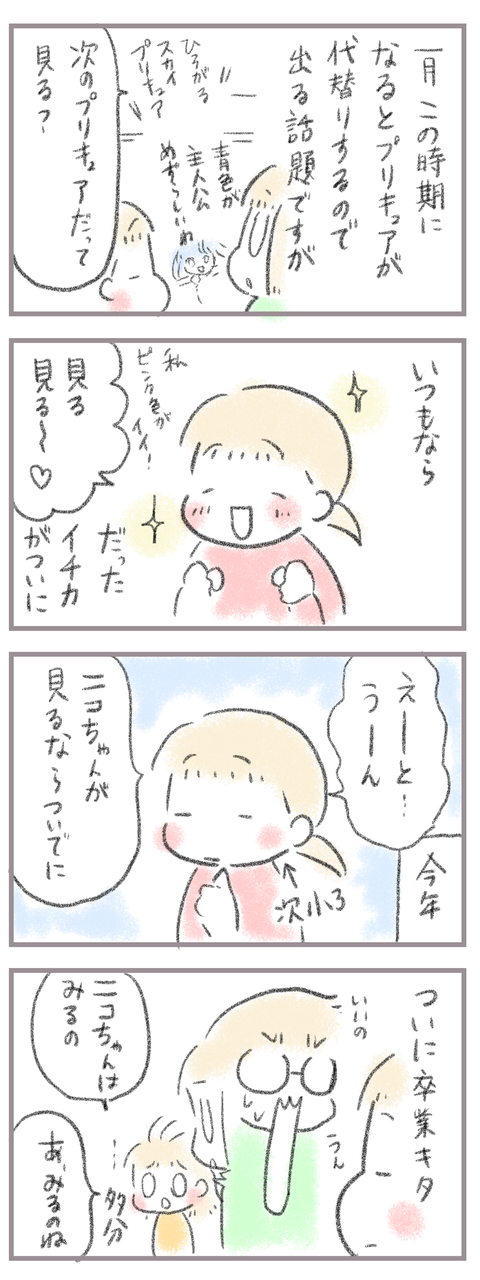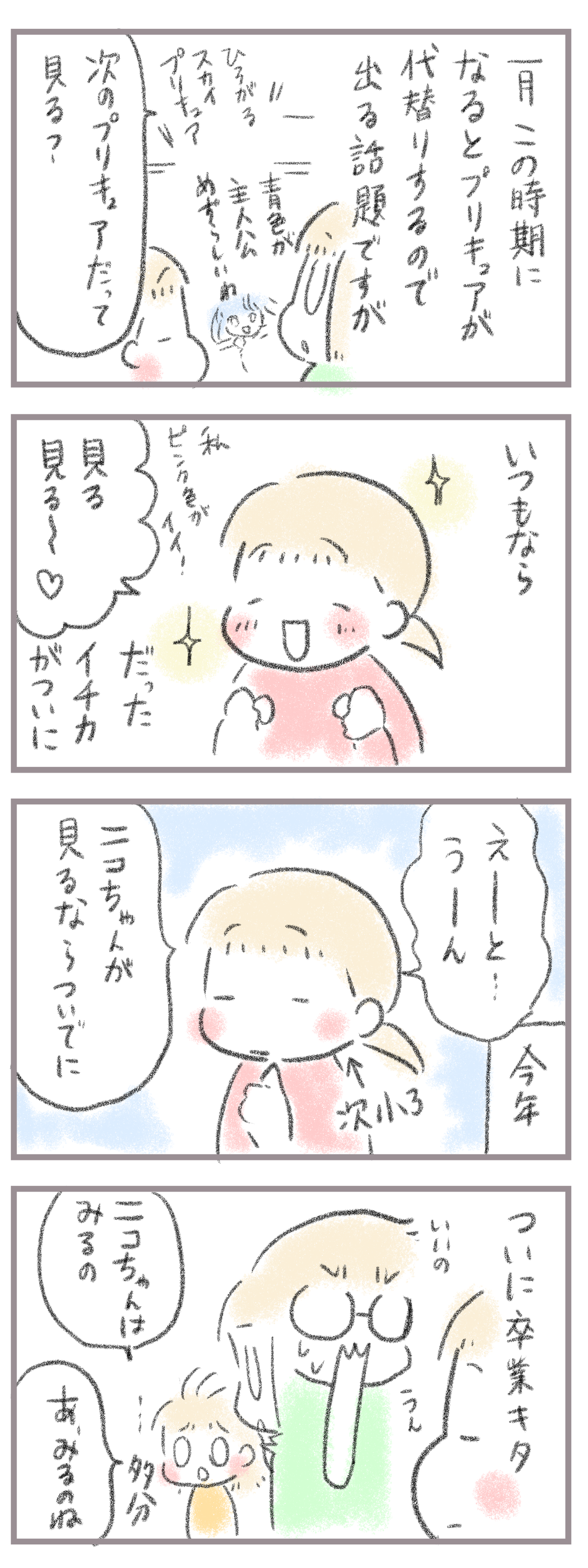 来てくださってありがとうございます。7歳(小2)イチカと5歳(年中)ニコ、姉妹の母です。この時期になると出てくる毎年の話題ですが新しいプリキュア発表されましたね!去年はぼちぼち卒業かと思っていたんですがこんな感じで↓ だったんですが、今年はというと… と言う ...