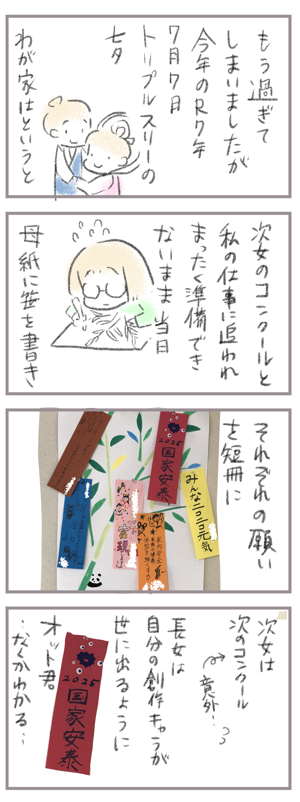 きてくださってありがとうございます。10歳(小5)イチカと8歳(小2)ニコ、姉妹の母です。先日七夕でしたね。我が家はというと…一応笹っぽいのを書いて短冊作りましたが当日…!!!年齢重ねるとどんどんこういうの雑になってきますね…今年度から手伝わせてもらっている仕 ...