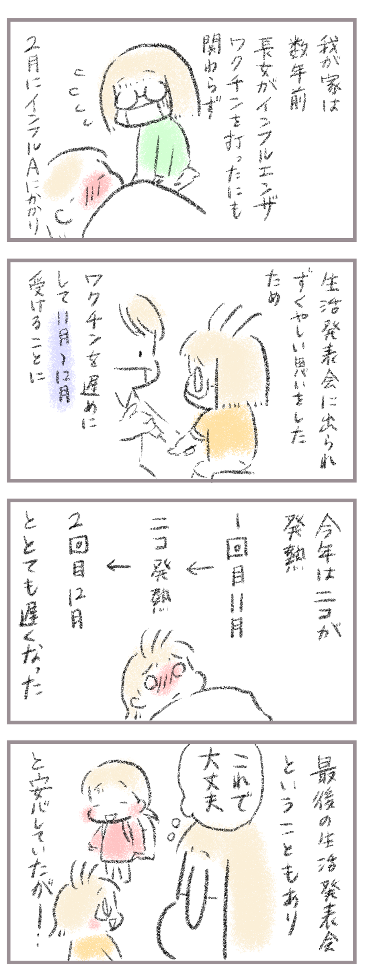 悪夢再来、最後の生活発表会、ピンチ!1 2024年02月18日 きてくださってありがとうございます。8歳(小3)イチカと6歳(年長)ニコ、姉妹の母です。以前の生活発表会で涙の欠席しまして、それからはインフルエンザワクチンを遅めに打ってます。 全ては生活発表会のため…!今回は特にインフルを打った後次女が発熱して予定日に打て ... 続きを読む きてくださってありがとうございます。8歳(小3)イチカと6歳(年長)ニコ、姉妹の母です。以前の生活発表会で涙の欠席しまして、それからはインフルエンザワクチンを遅めに打ってます。 全ては生活発表会のため…!今回は特にインフルを打った後次女が発熱して予定日に打てなかったので2回目は12月も中旬。2ヶ月だと最強の効果!を保ってる…はず…だったんですが…涙続きます><____________________姉妹ピアノインスタ作りました!長女のピアノ↓ 事情によりお子さんがピアノをやっている方のみの閲覧に変更しました次女のピアノ↓こちらはみなさん閲覧できる状態にしてます。あたらしい記事がアップされるとお知らせが届きます↓ ランキングに参加中よかったら一日一 回ぽちお願いします。にほんブログ村 タグ :#インフルエンザ#ワクチンの効果#生活発表会
