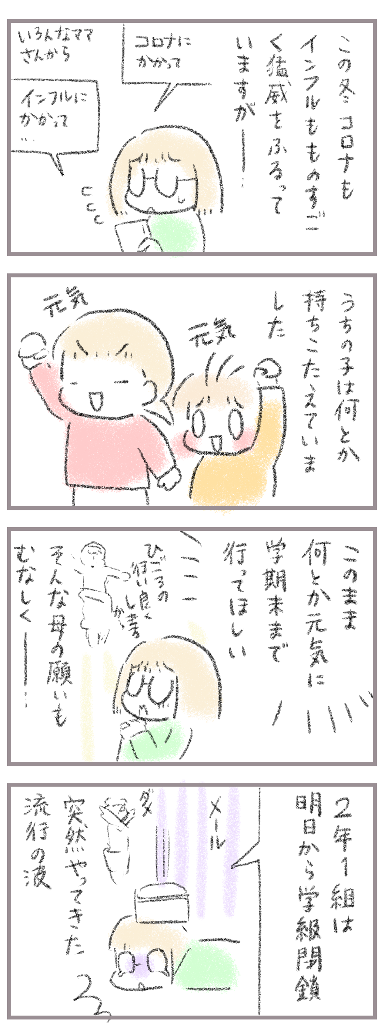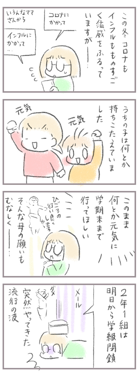 流行の波、ついに我が家に到達 2023年02月07日 きてくださってありがとうございます。7歳(小2)イチカと5歳(年中)ニコ、姉妹の母です。 ついにきました。学級閉鎖。Twitterでは時々トレンドで上がっていたのでじわじわきてるなぁとは思ってました。がまさかの今。昨日同じ小学校の子をたくさんみかけた、と同級生のマ ... 続きを読む きてくださってありがとうございます。7歳(小2)イチカと5歳(年中)ニコ、姉妹の母です。 ついにきました。学級閉鎖。Twitterでは時々トレンドで上がっていたのでじわじわきてるなぁとは思ってました。がまさかの今。昨日同じ小学校の子をたくさんみかけた、と同級生のママさんから聞いていたのですがほんとに次の日学級閉鎖。お〜の〜…とりあえず家で体内の病原菌を減らしていただいて終わったら元気に登校していただきますね〜…涙 給食だけでも食べに行きたい><__________ 出産妊娠記録まとめ長女妊娠出産記録→■次女妊娠切迫早産記録→■トイレトレーニングのお話→◾️______________Youtube動画アップ中→■ランキングに参加中よかったら一日一 回ぽちお願いします。にほんブログ村 タグ :#学級閉鎖#インフルエンザ