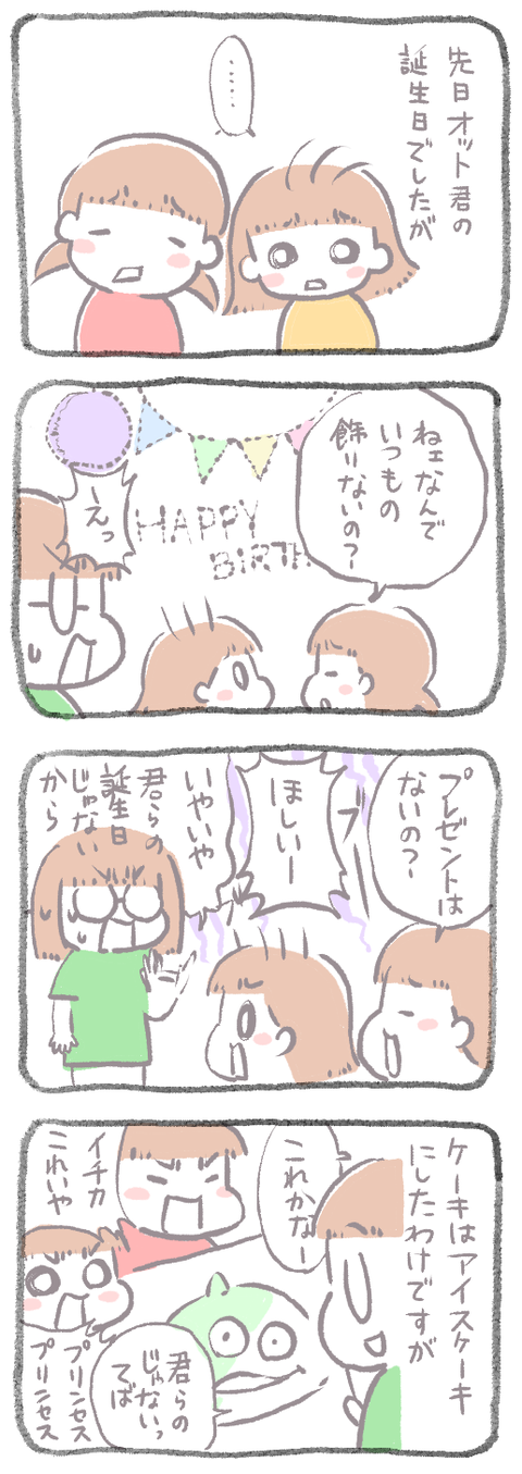 親と子ども誕生日の温度差がすごい 2020年08月15日 見にきてくださってありがとうございます。 5歳(年長)イチカと3歳ニコ、姉妹の母です。 誰の誕生日なんだか…汗親はま〜〜〜〜ったく来て欲しくない誕生日ですが子どもたちにはとても尊いもののようで。ケーキはほとんど子ども用なんですが一応名目は「オット君」向けな ... 続きを読む 見にきてくださってありがとうございます。 5歳(年長)イチカと3歳ニコ、姉妹の母です。 誰の誕生日なんだか…汗親はま〜〜〜〜ったく来て欲しくない誕生日ですが子どもたちにはとても尊いもののようで。ケーキはほとんど子ども用なんですが一応名目は「オット君」向けなので内容も含めあれが良かったんですが・・・・ドラえもんになりました。アイスケーキいいですよね^^いつでも食べられる点が。しかし冷凍庫を圧迫するのも確か。______________ 出産妊娠記録まとめ長女妊娠出産記録→■次女妊娠切迫早産記録→■トイレトレーニングのお話→◾️______________インスタグラムお休み中です→■ランキングに参加中よかったら一日一回ぽちお願いします。 にほんブログ村 タグ :#誕生日#子供にとっての「尊い」日#オット君