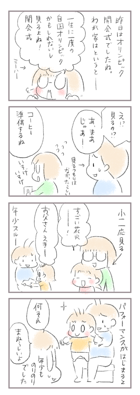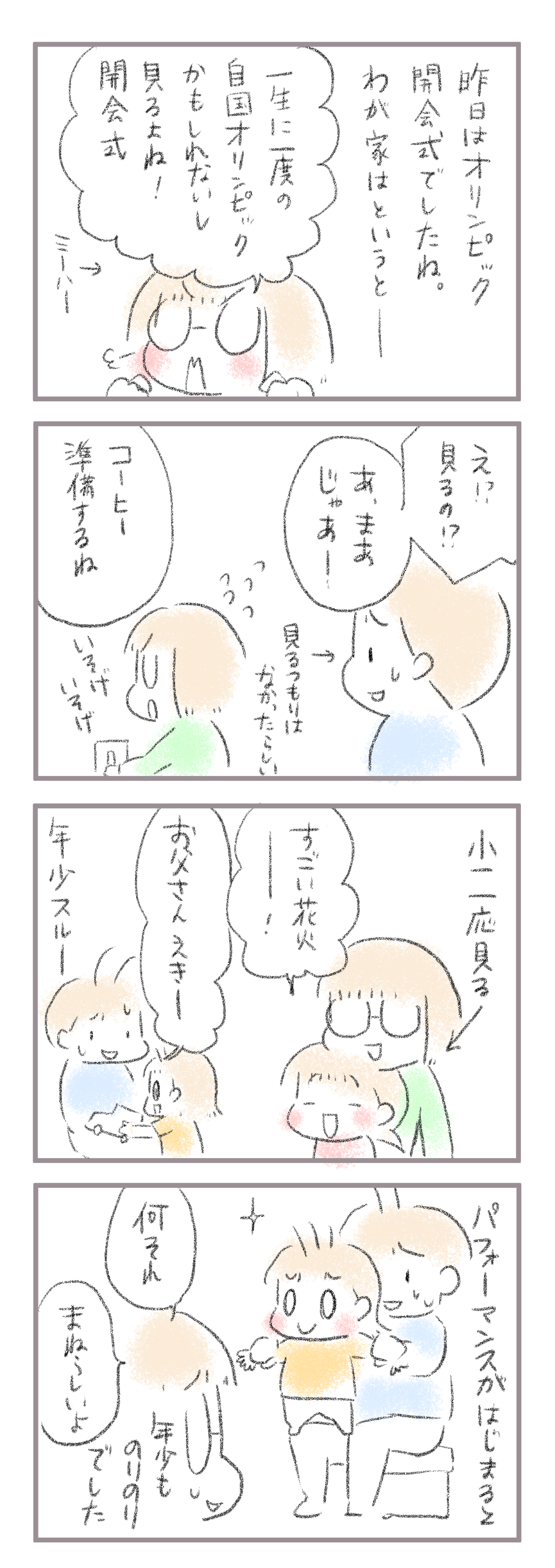 オリンピック開会式でしたね 2021年07月24日 きてくださってありがとうございます。6歳(小1)イチカと4歳(年少)ニコ、姉妹の母です。ついにオリンピック開幕。色々困難な中パフォーマンスの方々も選手の方々も本当にお疲れ様です。これから滞りなく無事大会を終わることをお祈りしております…!ということで我が家の ... 続きを読む きてくださってありがとうございます。6歳(小1)イチカと4歳(年少)ニコ、姉妹の母です。ついにオリンピック開幕。色々困難な中パフォーマンスの方々も選手の方々も本当にお疲れ様です。これから滞りなく無事大会を終わることをお祈りしております…!ということで我が家の開会式といえば… 母は開会式見る気満々でしたがオットくんは全くその気はなく^^せっかくなので、ということで家族巻き込んでの開会式視聴。小学一年生は多少お祭り雰囲気を楽しんでましたが完全スルーの年少。けれども演目が進むに従ってなぜか父の膝上でタイタニックポーズしている次女。…一応なんだかお祭りムードが移ったかな?結局子どもたちは9時退場、お開きとなりましたが…ゲーム音楽オンパレード選手入場に人生これほどもないくらい盛り上がっておりました^^コアな選曲ありがとうございます…!___________ 出産妊娠記録まとめ長女妊娠出産記録→■次女妊娠切迫早産記録→■トイレトレーニングのお話→◾️______________インスタグラムお休み中です→■ランキングに参加中よかったら一日一回ぽちお願いします。 にほんブログ村 タグ :#オリンピック#開会式#我が家の場合