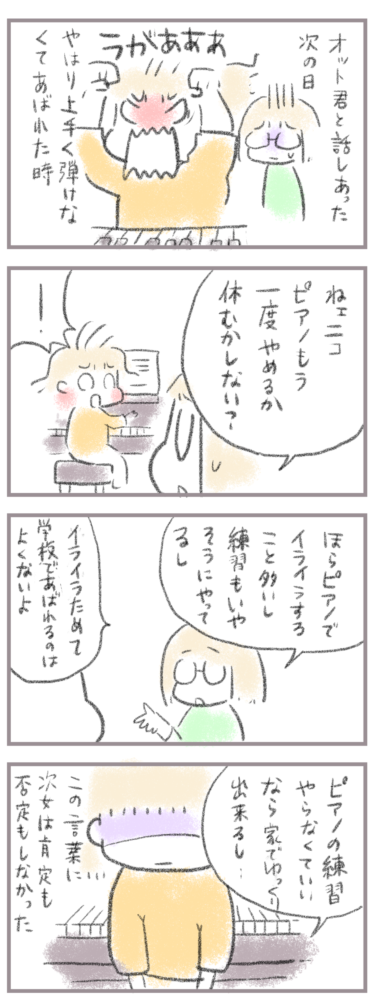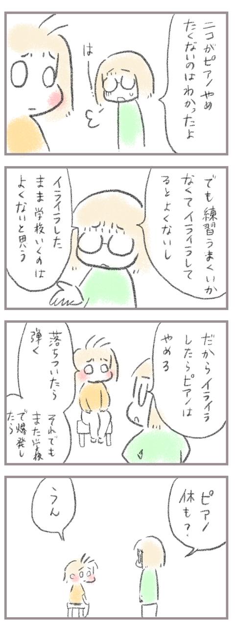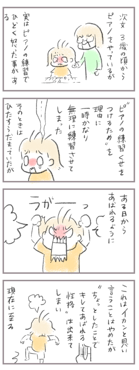 小学校問題連続勃発〜やらかし次女編6 2024年11月06日 きてくださってありがとうございます。9歳(小4)イチカと7歳(小1)ニコ、姉妹の母です。今回も前回の続きで前のお話はこちら↓小学校で何回か問題を起こし学校から電話がかかってきた。言われたことができず体育の授業に参加できなかったりやりたくないプリントをもらっ ... 続きを読む きてくださってありがとうございます。9歳(小4)イチカと7歳(小1)ニコ、姉妹の母です。今回も前回の続きで前のお話はこちら↓小学校で何回か問題を起こし学校から電話がかかってきた。言われたことができず体育の授業に参加できなかったりやりたくないプリントをもらった時我慢できずビリビリにしたり…母が思い当たる原因はイライラが溜まっていることそしてそのイライラの大半はピアノ。ピアノはとても壁が多く、楽しい、好き、という気持ちがないと続かない。次女はさほど練習が好きでもなく母が練習に追い立て、正直無理やり練習させていることも少なくなかった。がこうして問題を起こすほどイライラするならいっそのことイライラする原因を一度取り除く必要があると判断。次女に話をしてみることに。このあとまさかの行動に出る次女なんですが…続き↓ ____________________姉妹ピアノインスタ作りました!長女のピアノ↓ 事情によりお子さんがピアノをやっている方のみの閲覧に変更しました次女のピアノ↓こちらはみなさん閲覧できる状態にしてます。あたらしい記事がアップされるとお知らせが届きます↓ ランキングに参加中よかったら一日一 回ぽちお願いします。にほんブログ村 タグ :#ピアノ#イライラする原因#キレやすい性格#習い事