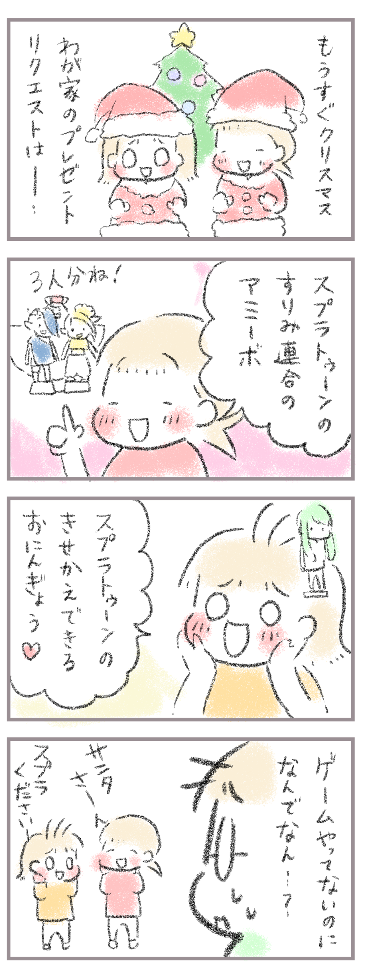 クリスマスプレゼント2023 2023年12月13日 きてくださってありがとうございます。8歳(小3)イチカと6歳(年長)ニコ、姉妹の母です。時は気付けばあと2週間ほどで今年も終わり。今年は阪神優勝に沸いた我が家でしたが(汗)12月はやっぱりクリスマスみなさんはどんなクリスマスプレゼントが届く予定でしょうか?我が ... 続きを読む きてくださってありがとうございます。8歳(小3)イチカと6歳(年長)ニコ、姉妹の母です。時は気付けばあと2週間ほどで今年も終わり。今年は阪神優勝に沸いた我が家でしたが(汗)12月はやっぱりクリスマスみなさんはどんなクリスマスプレゼントが届く予定でしょうか?我が家は…やっぱりスプラトゥーン><!長女のアミーボはまだ市場にありますが↓amiibo すりみ連合セット[フウカ/ウツホ/マンタロー](スプラトゥーンシリーズ)任天堂2023-11-17次女はおそらくもうないかな?↓ 発売した時に即買いましたーー;変わってなくてよかった><ちなみに去年は…長女↓ 次女↓ 次女はなんとかすみっこに流れてましたがやっぱり長女はスプラトゥーン3ちなみに全くゲームはやっておりません。我が家のSwitchは最近ほぼYoutubeしか稼働せず汗おそらくストーリー一人モードのアップデートが来る3月までは動かないと思います。そんな中でやっぱりこんなもの買ってました↓おととい発売のチョコエッグ!長女→ウツホ(黄色・と肌の色が黒い子)次女→フウカ(青色・髪も青色の女の子)が推しだったんですが出たものは…母推しのクマさんが出ました。う〜ん人外揃いで何より。とりあえずあと2個で終了したい(願望)____________________姉妹ピアノインスタ作りました!長女のピアノ↓ 事情によりお子さんがピアノをやっている方のみの閲覧に変更しました次女のピアノ↓こちらはみなさん閲覧できる状態にしてます。↑ブログリーダーは2023年12月末終了します。よければそれに変わるアプリ登録ができるようになっていますので登録していただければ、と思います↓ ランキングに参加中よかったら一日一 回ぽちお願いします。にほんブログ村 タグ :#クリスマスプレゼント#クリスマス2023#スプラトゥーン3