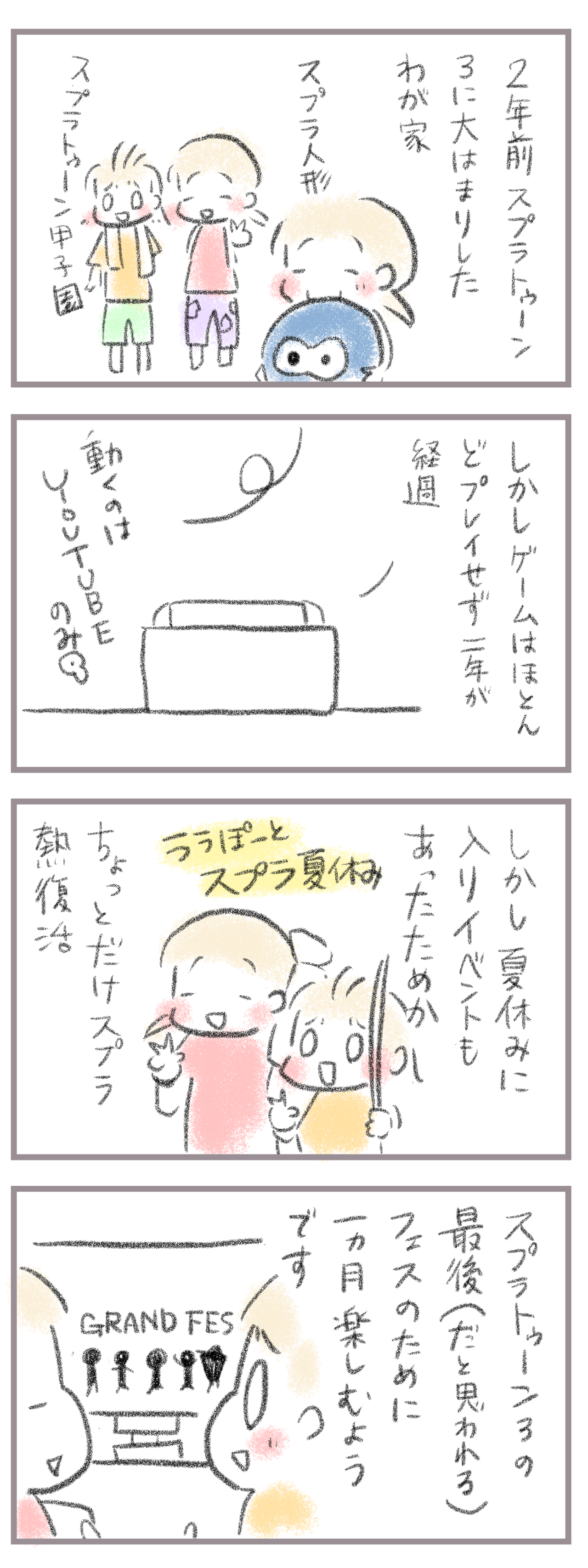 2年ぶりスプラトゥーン3熱が復活した理由 2024年08月17日 きてくださってありがとうございます。9歳(小4)イチカと7歳(小1)ニコ、姉妹の母です。スプラトゥーン3発売から2年がぼちぼち経過。その間触ったのは3ヶ月弱。やりにくかった理由はやはり課金かな…一度触ってから何日も触らず復活しようとしても課金切れでプレイできず ... 続きを読む きてくださってありがとうございます。9歳(小4)イチカと7歳(小1)ニコ、姉妹の母です。スプラトゥーン3発売から2年がぼちぼち経過。その間触ったのは3ヶ月弱。やりにくかった理由はやはり課金かな…一度触ってから何日も触らず復活しようとしても課金切れでプレイできず母も最初1年は契約したけどあんまりやってないしで停止気味。よしんばやるからと1ヶ月契約してもやったの1回とか勿体なさすぎてなかなかできず…任天堂さん…1日プレイで50円とかやってくれませんかね😭そんなわけで我が家で普及しにくかったスプラトゥーン3。ですが嫌いになったわけではなく今でも大好き(キャラとか世界とか)スプラトゥーン3のイベントがあるといえば出向いてしっかり参戦します↓(イベントでもらった腕輪とうちわ)そんな2人ですが久しぶりにプレイを再開しました。理由は2年間アップデートがついに最終。ラストは絶対やりたいということで課金再開(前回残ってたやつ使用)今月は頑張るそうです。任天堂Switchはぼちぼち来年くらいで新ハードモデルらしいし最後はポケモンのバイオレット&スカーレットを買って終わりかな?と思うんですが、どうなんだろう…ぼちぼちスマホへ移行して新ハードはもう買わない世界線へ進むのか…?それともやっぱりポケモンが好きだから新しいのをするために買うのか…?難しい時期に入ってきたのは確かなようです。願わくば…安い方お願いします涙____________________姉妹ピアノインスタ作りました!長女のピアノ↓ 事情によりお子さんがピアノをやっている方のみの閲覧に変更しました次女のピアノ↓こちらはみなさん閲覧できる状態にしてます。あたらしい記事がアップされるとお知らせが届きます↓ ランキングに参加中よかったら一日一 回ぽちお願いします。にほんブログ村 タグ :#スプラトゥーン3#復活#小学生