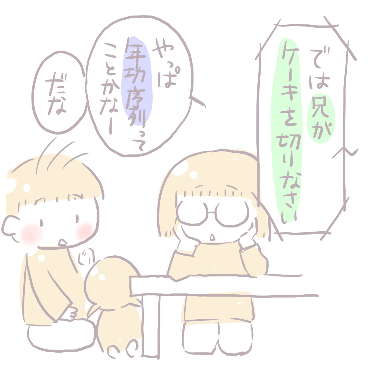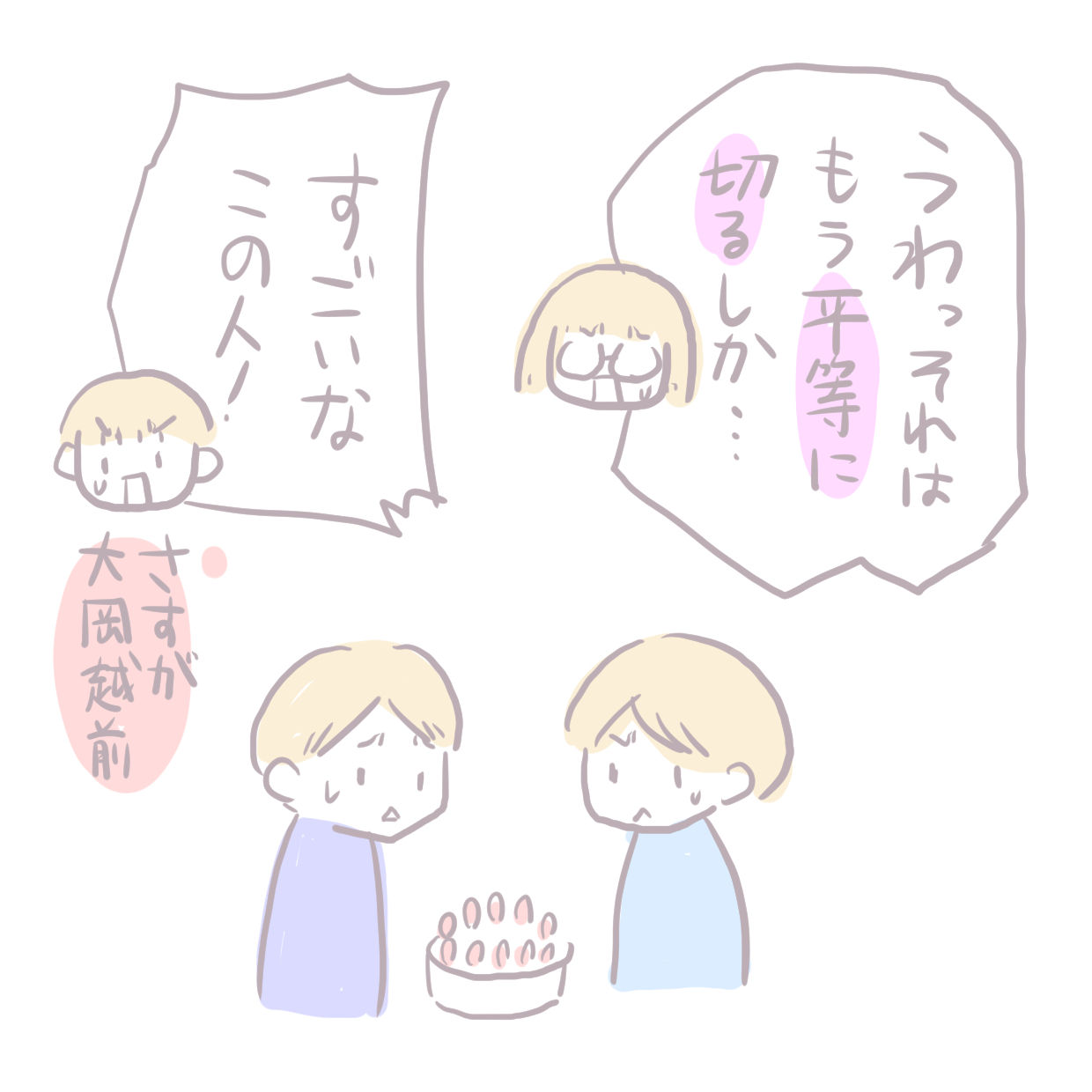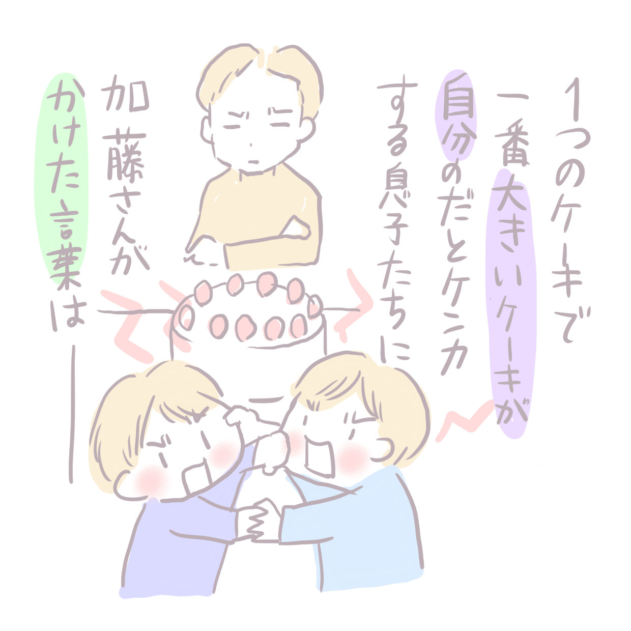 夫婦が感動した「兄弟喧嘩仲裁方法」 2018年10月14日 いつも見てくださってありがとうございます。3歳と1歳の姉妹を育ててるのか育てられているのか最近わからないヘロヘロ母です。先日テレビをみていて夫婦ともにびっくりしたお話です。一度流し見しただけなのでセリフが少し違ってる箇所があるかもしれませんがとにかくすごい ... 続きを読む いつも見てくださってありがとうございます。3歳と1歳の姉妹を育ててるのか育てられているのか最近わからないヘロヘロ母です。先日テレビをみていて夫婦ともにびっくりしたお話です。一度流し見しただけなのでセリフが少し違ってる箇所があるかもしれませんがとにかくすごい仲裁方法。これぞ絶対平等の法則( ゚Д゚)これをとっさにいえるところが震えました。これはまねできない><けどできればまねしたい喧嘩仲裁方法でした。______________出産妊娠記録まとめ長女妊娠出産記録→■次女妊娠切迫早産記録→■______________インスタグラムでブログ更新お知らせと次女赤ちゃんイラストやってます→■ ↓ランキングに参加中よかったら一日一回ぽちお願いします。にほんブログ村 人気ブログランキング タグ :#兄弟げんか#仲裁方法#テレビ