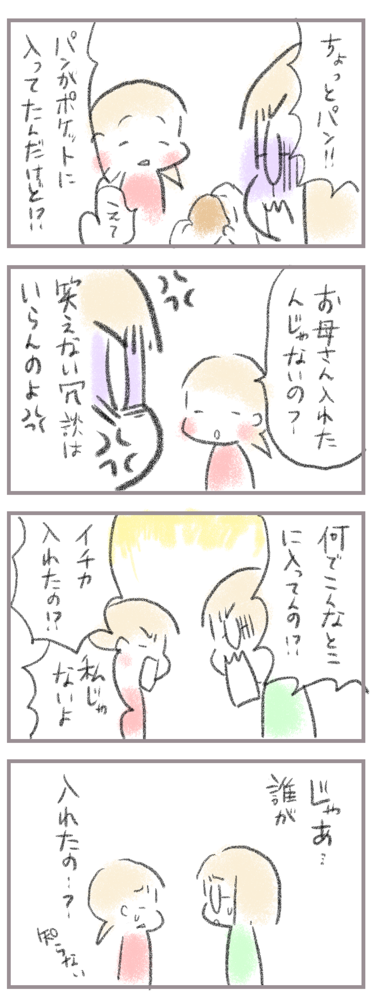 きてくださってありがとうございます。10歳(小5)イチカと8歳(小2)ニコ、姉妹の母です。今回も前のお話の続きでポケットにくしゃくしゃのパンが入っていた話です。前回のお話↓あまりにもイチカが言わないでと強くいうのでポケットにパンって結構普通にあるのかな?と思っ ...