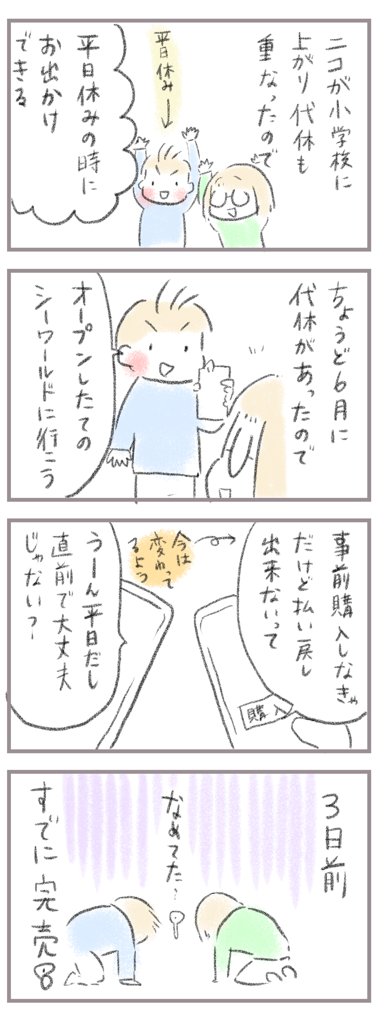 代休あるある?やらかしたチケット予約 2024年06月10日 きてくださってありがとうございます。9歳(小4)イチカと7歳(小1)ニコ、姉妹の母です。ついに2人とも小学生、待ちに待ったのが…代休!ですが…代休だから直前でも大丈夫、人いないと思ったらこの辺りめっちゃ代休被ってるようで近場の予約必要施設は全て埋まってた;;泣 ... 続きを読む きてくださってありがとうございます。9歳(小4)イチカと7歳(小1)ニコ、姉妹の母です。ついに2人とも小学生、待ちに待ったのが…代休!ですが…代休だから直前でも大丈夫、人いないと思ったらこの辺りめっちゃ代休被ってるようで近場の予約必要施設は全て埋まってた;;泣くしかないよヨヨヨ;;仕方なく予約なしのところに行ってきます><次はうまく取らないとな…____________________姉妹ピアノインスタ作りました!長女のピアノ↓ 事情によりお子さんがピアノをやっている方のみの閲覧に変更しました次女のピアノ↓こちらはみなさん閲覧できる状態にしてます。あたらしい記事がアップされるとお知らせが届きます↓ ランキングに参加中よかったら一日一 回ぽちお願いします。にほんブログ村 タグ :#切ない#代休