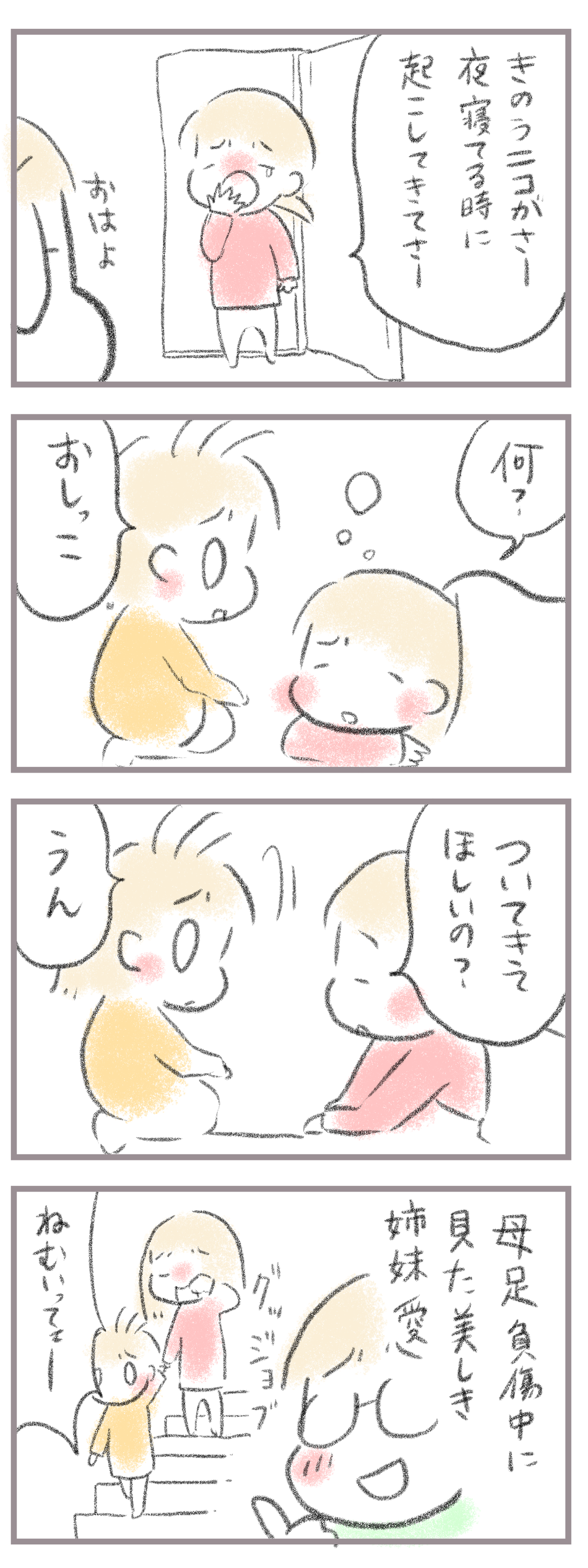 母負傷ゆえに見れた光景 2025年11月26日 きてくださってありがとうございます。10歳(小5)イチカと8歳(小2)ニコ、姉妹の母です。母、先日足を負傷。あまりまだ動けません。そんな中のお話です。次女はまだ夜1人でトイレに行けません。いつもは母を起こしますがなんと昨日は長女を起こしたとか。まさかの姉妹愛を ... 続きを読む きてくださってありがとうございます。10歳(小5)イチカと8歳(小2)ニコ、姉妹の母です。母、先日足を負傷。あまりまだ動けません。そんな中のお話です。次女はまだ夜1人でトイレに行けません。いつもは母を起こしますがなんと昨日は長女を起こしたとか。まさかの姉妹愛をここで見られるとはある意味怪我の功名です。____________________姉妹ピアノインスタ作りました!長女のピアノ↓ 事情によりお子さんがピアノをやっている方のみの閲覧に変更しました次女のピアノ↓こちらはみなさん閲覧できる状態にしてます。あたらしい記事がアップされるとお知らせが届きます↓ ランキングに参加中よかったら一日一 回ぽちお願いします。にほんブログ村 タグ :#ありがたい光景#普段仲悪そうなのに#姉妹関係