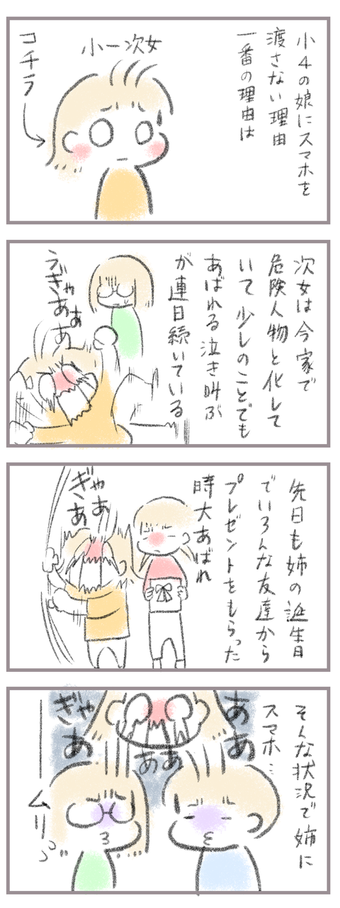 スマホを欲しがる子どもVS親4(完) 2025年03月01日 きてくださってありがとうございます。10歳(小4)イチカと7歳(小1)ニコ、姉妹の母です。今回も前回の続きでスマホを欲しがる我が子与えるかどうか悩んだ話です。前のお話はこちらから↓次女の沸点が異様に低い昨今。これを招いたのは色々事情がありますがその話はまた別の ... 続きを読む きてくださってありがとうございます。10歳(小4)イチカと7歳(小1)ニコ、姉妹の母です。今回も前回の続きでスマホを欲しがる我が子与えるかどうか悩んだ話です。前のお話はこちらから↓次女の沸点が異様に低い昨今。これを招いたのは色々事情がありますがその話はまた別の機会にということで姉にだけ与えて妹に与えない、は我が家では現在めちゃくちゃタブーです。(うまくやれば行ける時もあるけれども)まだ1年生ということもあり早すぎる、という結論に達しました。うちは中学生導入予定となってますが本音を言うと16で良いんじゃないか?と思う今日この頃。何せ中学受験しない身なので高校受験が関わってくる年齢。その前に渡すのはリスクがめちゃくちゃあるし反抗期と戦わなきゃいけないので負担増ですがまぁ仕方ないかな。あと2年しっかりルール決めをしてその時期に挑みたいと思います。ついでに妹のフォローもしっかりしないと汗育児っていつになっても悩みは尽きませんね…高校になったらもう最低限しかいうつもりはないけど次はお金の問題が…汗た、たいへんだぁ…でもカスカスの母の心の栄養、それが子供たちなんですよね。子供たちが大きくなるのを見るのってやっぱりいい。希望に溢れている子どもたちはキラキラしている。それは毎日思うことです。少し長くなりましたがスマホと小学生のお話はこちらで終了となります。長々読んでくださってありがとうございました。____________________姉妹ピアノインスタ作りました!長女のピアノ↓ 事情によりお子さんがピアノをやっている方のみの閲覧に変更しました次女のピアノ↓こちらはみなさん閲覧できる状態にしてます。あたらしい記事がアップされるとお知らせが届きます↓ ランキングに参加中よかったら一日一 回ぽちお願いします。にほんブログ村 タグ :#スマホと小学生#姉妹関係