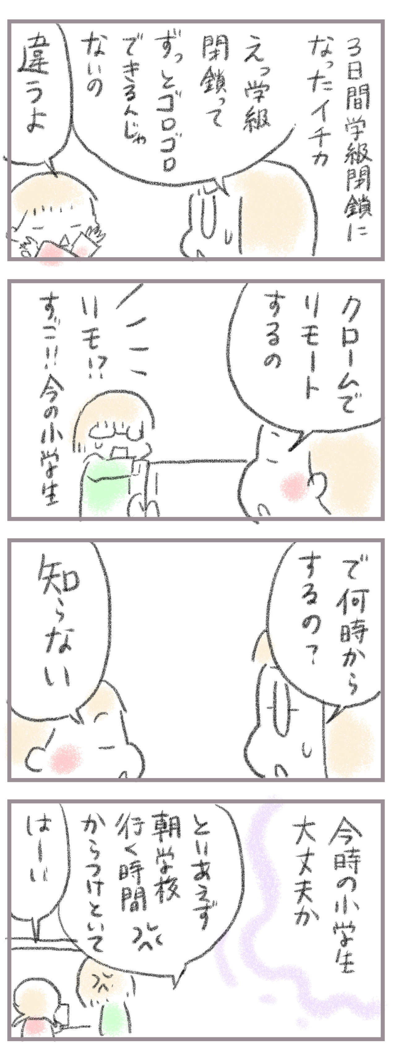 小学生のリモート授業の内容1 2023年02月09日 きてくださってありがとうございます。7歳イチカ(小2)と5歳(年中)ニコ、姉妹の母です。長女、学級閉鎖中でして…どうしてるかというと… リモートなんてなんてナウイものをやるんだろうと思っていたらさすがは小学生低学年始まる時間すら曖昧な状態のザルな感じでした。 ... 続きを読む きてくださってありがとうございます。7歳イチカ(小2)と5歳(年中)ニコ、姉妹の母です。長女、学級閉鎖中でして…どうしてるかというと… リモートなんてなんてナウイものをやるんだろうと思っていたらさすがは小学生低学年始まる時間すら曖昧な状態のザルな感じでした。始まる時間も誰かが9時にきたらいいですか?って書いてあって(メッセージ欄があるらしい)それに対するプリントもペラいのが一枚だけ(リモートについては一切触れていない)だ、大丈夫か…?とりあえず隣の部屋で静かにしていたわけですが…肝心の中身はというと…面白かったので数回に分けて実況中継します。続きはこちら↓ _________ 出産妊娠記録まとめ長女妊娠出産記録→■次女妊娠切迫早産記録→■トイレトレーニングのお話→◾️______________Youtube動画アップ中→■ランキングに参加中よかったら一日一 回ぽちお願いします。にほんブログ村 タグ :#小学2年生#学級閉鎖#リモート授業#なんだかふわふわ