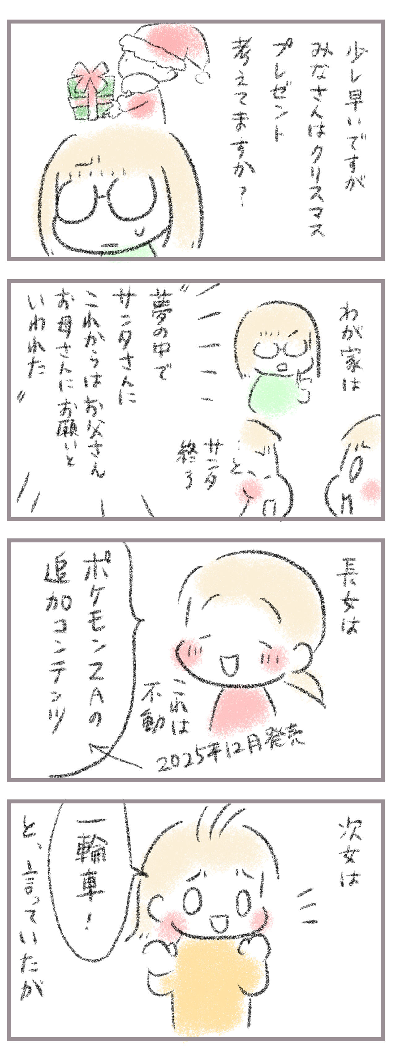 きてくださってありがとうございます。10歳(小5)イチカと8歳(小2)ニコ、姉妹の母です。毎年11月になるとザワザワするのがクリスマスプレゼント。我が家はついに…もう色々トラブルもあるので今年は親から渡すことにしました。夢でサンタさんに「もう他の小さい子のところ ...