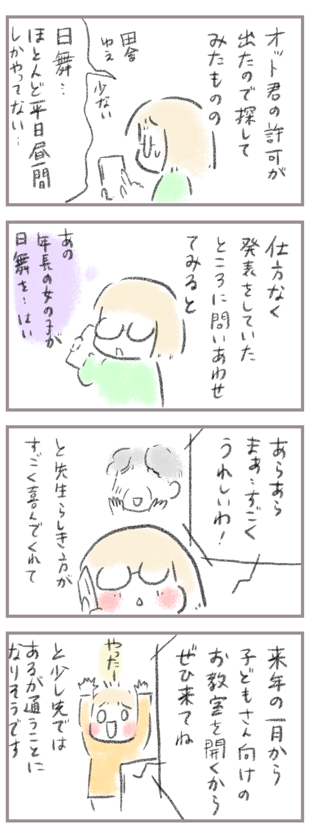 親が驚く次女の女子力3(完) 2023年11月09日 来てくださってありがとうございます。8歳(小3)イチカと6歳(年長)ニコ、姉妹の母です。次女が日舞をやりたいと言い出したわけですが…その続きのお話です初めのお話 ↓ 前のお話↓ 日舞ですが、うちの近くは平日昼間のお稽古が多くてなかなか夕方以降の時間がない…遠 ... 続きを読む 来てくださってありがとうございます。8歳(小3)イチカと6歳(年長)ニコ、姉妹の母です。次女が日舞をやりたいと言い出したわけですが…その続きのお話です初めのお話 ↓ 前のお話↓ 日舞ですが、うちの近くは平日昼間のお稽古が多くてなかなか夕方以降の時間がない…遠方だとこれから小学生になる次女にとっては負担になる…色々考えてとりあえず最初にみた発表会の日舞団体に連絡をとっていただきそこから先生に繋いでいただきました。ものすごく気さくな先生で次女が習いたいというとすごく喜んでくれてただ今の時間はやはり平日昼間。しかも人がいっぱいで入れない。そこで来年度から始める子ども日舞教室に来ませんか、とお誘いしてもらえることになりました。次女大喜び。ちょっと間は開くけれども無事日舞に触れる機会が得られそうでよかったな、と思います。またその頃どんな感じなのかの記事が書けたらいいな〜なんて。子ども、いろんなことに目覚めていきますね(衝撃____________________姉妹ピアノインスタ作りました!長女のピアノ↓ 事情によりお子さんがピアノをやっている方のみの閲覧に変更しました次女のピアノ↓こちらはみなさん閲覧できる状態にしてます。↑ブログリーダーは2023年12月末終了します。よければそれに変わるアプリ登録ができるようになっていますので登録していただければ、と思います↓ ランキングに参加中よかったら一日一 回ぽちお願いします。にほんブログ村 タグ :#次女#年長#日舞#女子力