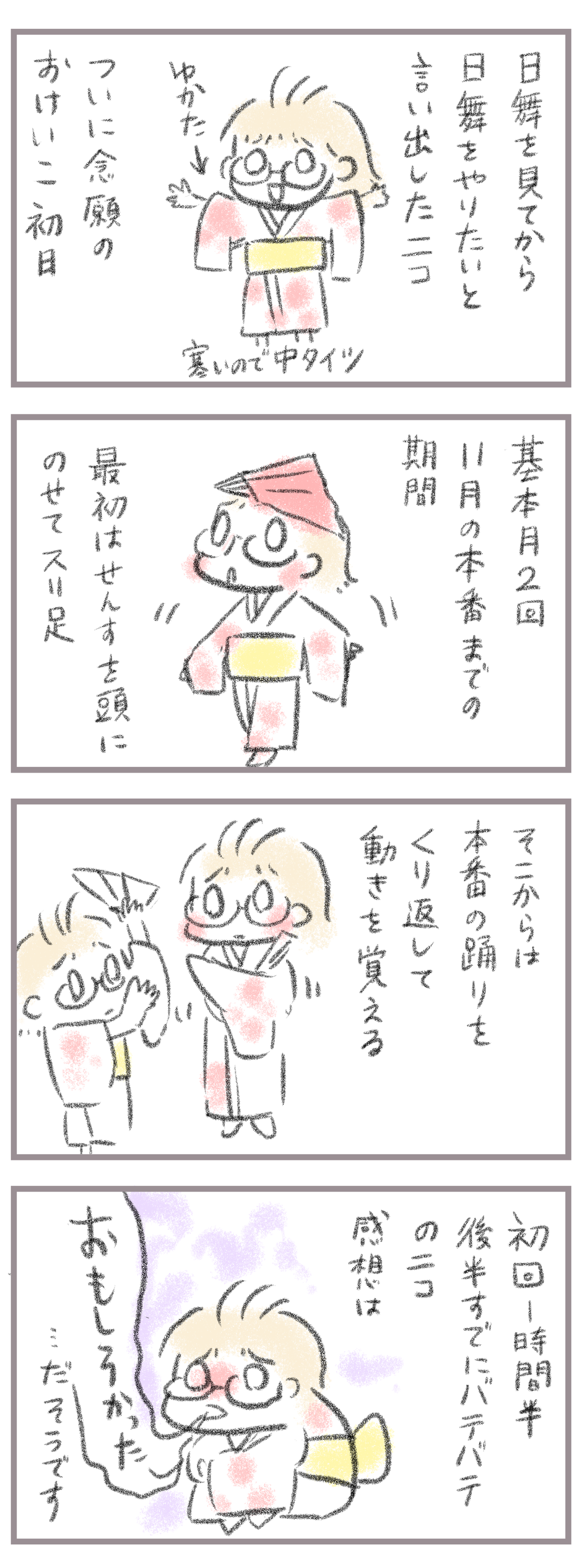 日舞のおけいこってどんなん? 2024年02月06日 きてくださってありがとうございます。8歳(小3)イチカと6歳(年長)ニコ、姉妹の母です。先日、日舞のお稽古が始まったとお伝えしましたが、本格的なものではなく市の文化振興行事の一環で11月の舞台に向けて子どもたちに日舞に触れてもらおう、といった趣向のもので、お稽 ... 続きを読む きてくださってありがとうございます。8歳(小3)イチカと6歳(年長)ニコ、姉妹の母です。先日、日舞のお稽古が始まったとお伝えしましたが、本格的なものではなく市の文化振興行事の一環で11月の舞台に向けて子どもたちに日舞に触れてもらおう、といった趣向のもので、お稽古料も心ばかり…感謝1から日舞を学ぶものではなく、一つの演目をひたすらやり続ける、という形になってます。最初は元気にやっていたニコも流石に1時間超えるとちょっとお疲れモード。小3のイチカはさすがというか、ここは体力の差が出て最後までニコニコでお友達と踊ってました。あまりにヘロヘロなので感想を聞くのは憚られたものの…聞いてみると楽しい、だそうで。先生のご厚意に感謝しかない><!11月の本番に向けて楽しもうね!____________________姉妹ピアノインスタ作りました!長女のピアノ↓ 事情によりお子さんがピアノをやっている方のみの閲覧に変更しました次女のピアノ↓こちらはみなさん閲覧できる状態にしてます。あたらしい記事がアップされるとお知らせが届きます↓ ランキングに参加中よかったら一日一 回ぽちお願いします。にほんブログ村 タグ :#日舞#お稽古#習い事#幼稚園#年長