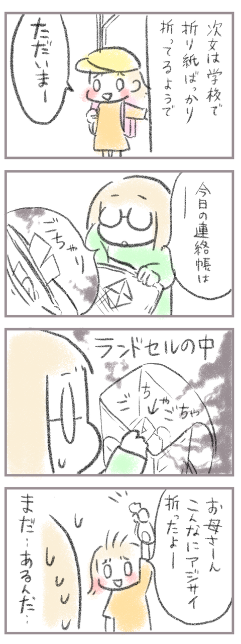 1年休み時間にやってること 2024年06月05日 きてくださってありがとうございます。9歳(小4)イチカと7歳(小1)ニコ、姉妹の母です。折り紙おりすぎ!!!!いや、量が半端ないです。これは100枚くらい一気に無くなりそうな予感がする…も、勿体無い…君は折り紙博士になるのかい…汗このお話は続きが少しあります。 ... 続きを読む きてくださってありがとうございます。9歳(小4)イチカと7歳(小1)ニコ、姉妹の母です。折り紙おりすぎ!!!!いや、量が半端ないです。これは100枚くらい一気に無くなりそうな予感がする…も、勿体無い…君は折り紙博士になるのかい…汗このお話は続きが少しあります。このあと母が衝撃を受けたお話です。____________________姉妹ピアノインスタ作りました!長女のピアノ↓ 事情によりお子さんがピアノをやっている方のみの閲覧に変更しました次女のピアノ↓こちらはみなさん閲覧できる状態にしてます。あたらしい記事がアップされるとお知らせが届きます↓ ランキングに参加中よかったら一日一 回ぽちお願いします。にほんブログ村 タグ :#折り紙#折り紙大好き#小1