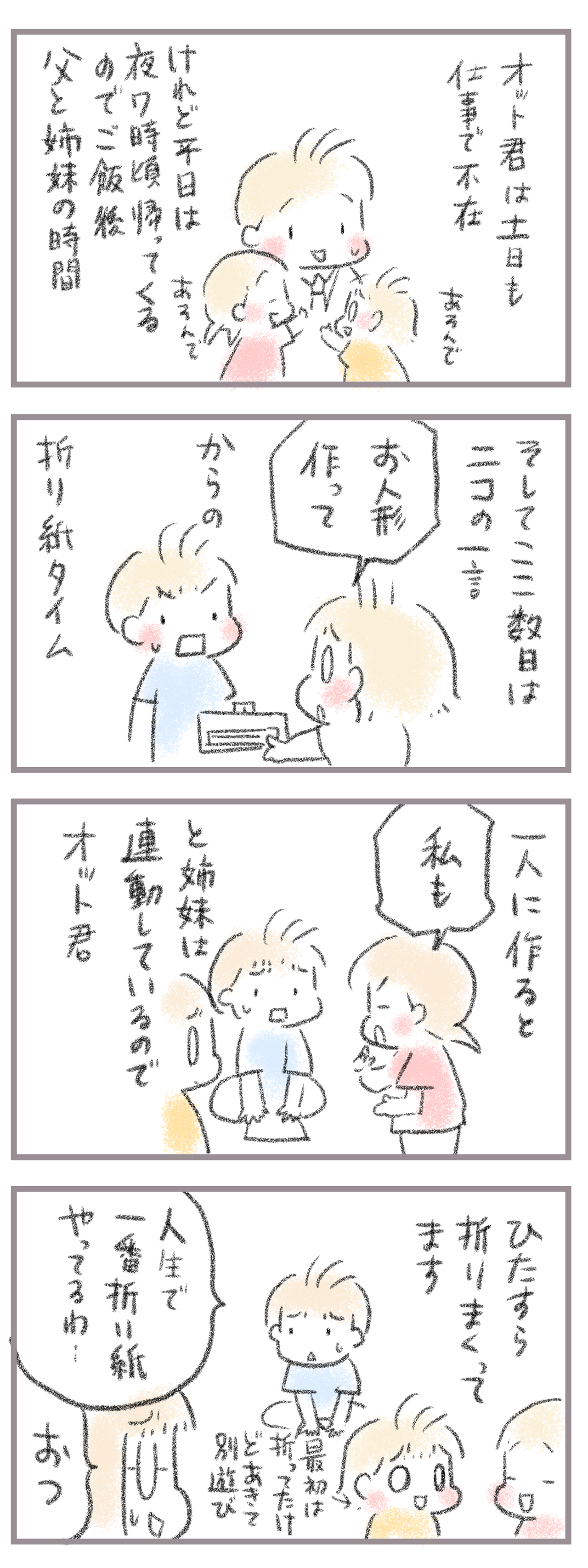 姉妹は連動する〜室内遊び 2022年07月04日 きてくださってありがとうございます。7歳(小2)イチカと5歳(年中)ニコ、姉妹の母です。 夜はオットくんと姉妹の時間。ほんの30分から1時間ほどですが全力で遊んでくれます(感謝)現在は折り紙で人形作り最初は2人とも一緒にやってるんですがやっぱり折り方が難しいよう ... 続きを読む きてくださってありがとうございます。7歳(小2)イチカと5歳(年中)ニコ、姉妹の母です。 夜はオットくんと姉妹の時間。ほんの30分から1時間ほどですが全力で遊んでくれます(感謝)現在は折り紙で人形作り最初は2人とも一緒にやってるんですがやっぱり折り方が難しいようで最終お父さん任せに…そんなオットくんの作品はこちら↓ 一つ違うやつはニコが和風を別で発注した模様^^;折り紙は最近動画がたくさんあるようなので↑参考にした動画お人形遊びの好きなお子様がいたら夏休みの室内遊びにぜひ^^_______Youtube動画作ってます→■新しい動画アップしました6月22日みてくださった方ありがとうございます;;__________すくパラやってます^^___________ 出産妊娠記録まとめ長女妊娠出産記録→■次女妊娠切迫早産記録→■トイレトレーニングのお話→◾️______________インスタグラム動画アップ中→■ランキングに参加中よかったら一日一 回ぽちお願いします。 にほんブログ村 タグ :#折り紙#室内遊び#姉妹は一心別体