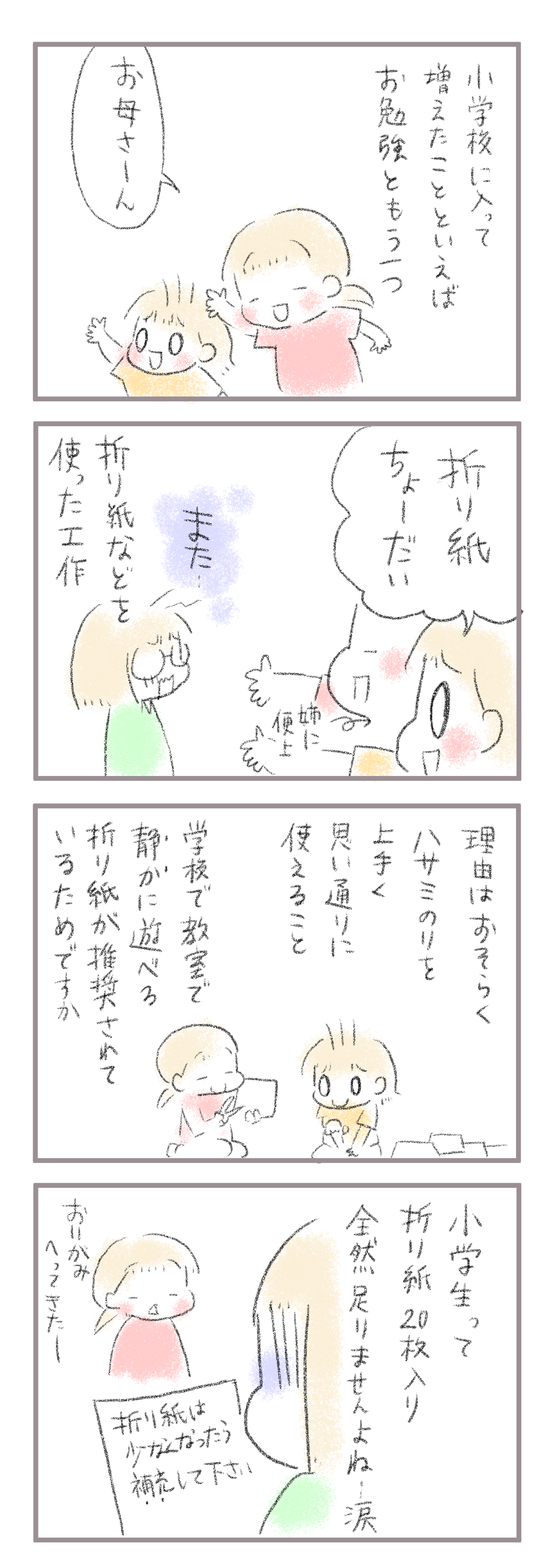 小学生になって消費が激しくなったもの 2021年09月23日 きてくださってありがとうございます。6歳(小1)イチカと4歳(年少)ニコ、姉妹の母です。 そうなんです、工作時間増えました。そして折り紙の消費が半端ない。色塗らなくても色ついてるあたりがいいのか…折り紙20枚なんて全くもって足りないのでコストコで1200枚折り紙を ... 続きを読む きてくださってありがとうございます。6歳(小1)イチカと4歳(年少)ニコ、姉妹の母です。 そうなんです、工作時間増えました。そして折り紙の消費が半端ない。色塗らなくても色ついてるあたりがいいのか…折り紙20枚なんて全くもって足りないのでコストコで1200枚折り紙をシェアして300枚買いましたが欲しい色が不足してきました(どんだけ無駄にしてるのやら…;;)お勉強じゃないあたり我が家っぽい涙気がついたらハサミにのりにテープに。家の中紙屑まみれ。長女がやるから次女もやる。現在段ボールカッターは使わせてないのでダンボールの登場はすくないですがそのうち使いそうだなぁ…。 ___________ 出産妊娠記録まとめ長女妊娠出産記録→■次女妊娠切迫早産記録→■トイレトレーニングのお話→◾️______________インスタグラムお休み中です→■ランキングに参加中よかったら一日一回ぽちお願いします。 にほんブログ村 タグ :#小学生#工作#紙屑まみれ#折り紙