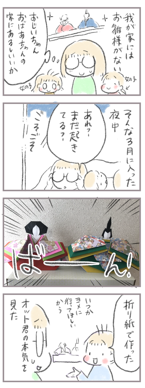 オット、渾身の雛祭り 2022年03月03日 きてくださってありがとうございます。7歳(小1)イチカと4歳(年少)ニコ、姉妹の母です。昨日の記事が連続の記事になっているんですが本日はひな祭りということでお休みしてその内容になっています。 その後子どもたちと一緒に 壁をこんな感じでパワーアップさせてました ... 続きを読む きてくださってありがとうございます。7歳(小1)イチカと4歳(年少)ニコ、姉妹の母です。昨日の記事が連続の記事になっているんですが本日はひな祭りということでお休みしてその内容になっています。 その後子どもたちと一緒に 壁をこんな感じでパワーアップさせてました^^;ちなみに上のお雛様一体はイチカが作りましたがそれ以外全部オットくん作です。ど、どんだけ〜〜〜〜^^;_________Youtube動画作りました→■ちょっと時間の関係でもう少しアップ遅くなります^^;__________すくパラやってます^^___________ 出産妊娠記録まとめ長女妊娠出産記録→■次女妊娠切迫早産記録→■トイレトレーニングのお話→◾️______________インスタグラム動画アップ中→■ランキングに参加中よかったら一日一回ぽちお願いします。 にほんブログ村 タグ :#ひなまつり#オット#折り紙#手作り雛人形