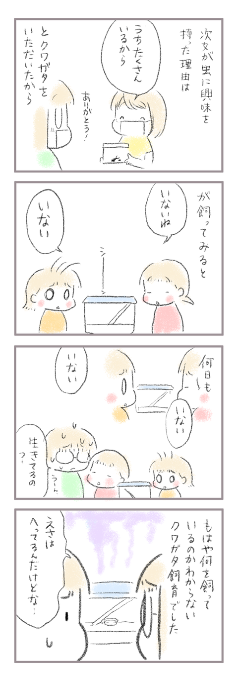 来てくださってありがとうございます。6歳(小1)イチカと4歳(年少)ニコ、姉妹の母です。前回虫取りを正直初めてした我が家でしたが…(→◾️) クワガタってずっと土に潜っとるもんですか…?カブトムシは出てしばらくしては土でしたがそれからは結構ブンブン飛んでて… ...