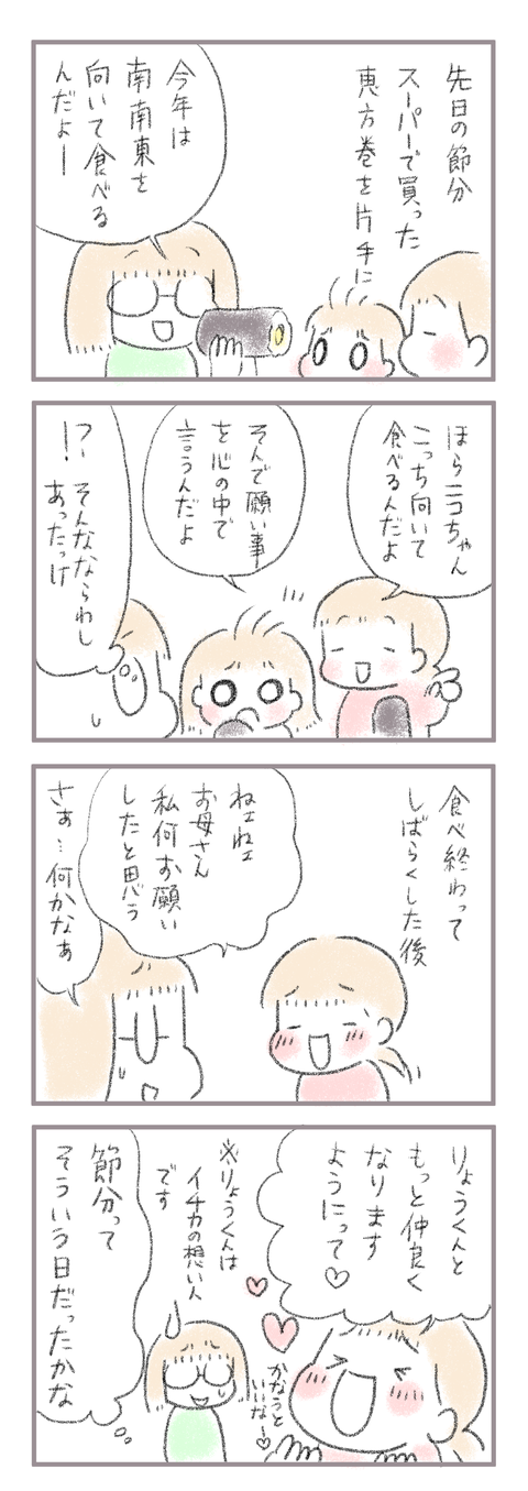 思ってたんと違った節分の日 2021年02月04日 きてくださってありがとうございます。5歳(年長)イチカと3歳ニコ、姉妹の母です。自転車のお話の途中ですが2月2日の節分のお話です。 なんか色々混ざってないかい…?それとも願い事言うなんていう風習あったのかな…?ちょっと母のイメージと違う節分が展開された令和3年 ... 続きを読む きてくださってありがとうございます。5歳(年長)イチカと3歳ニコ、姉妹の母です。自転車のお話の途中ですが2月2日の節分のお話です。 なんか色々混ざってないかい…?それとも願い事言うなんていう風習あったのかな…?ちょっと母のイメージと違う節分が展開された令和3年の節分のお話でした。 ______________ 出産妊娠記録まとめ長女妊娠出産記録→■次女妊娠切迫早産記録→■トイレトレーニングのお話→◾️______________インスタグラムお休み中です→■ランキングに参加中よかったら一日一回ぽちお願いします。 にほんブログ村 タグ :#節分#恵方巻き#思ってたんと違う節分#5歳の恋