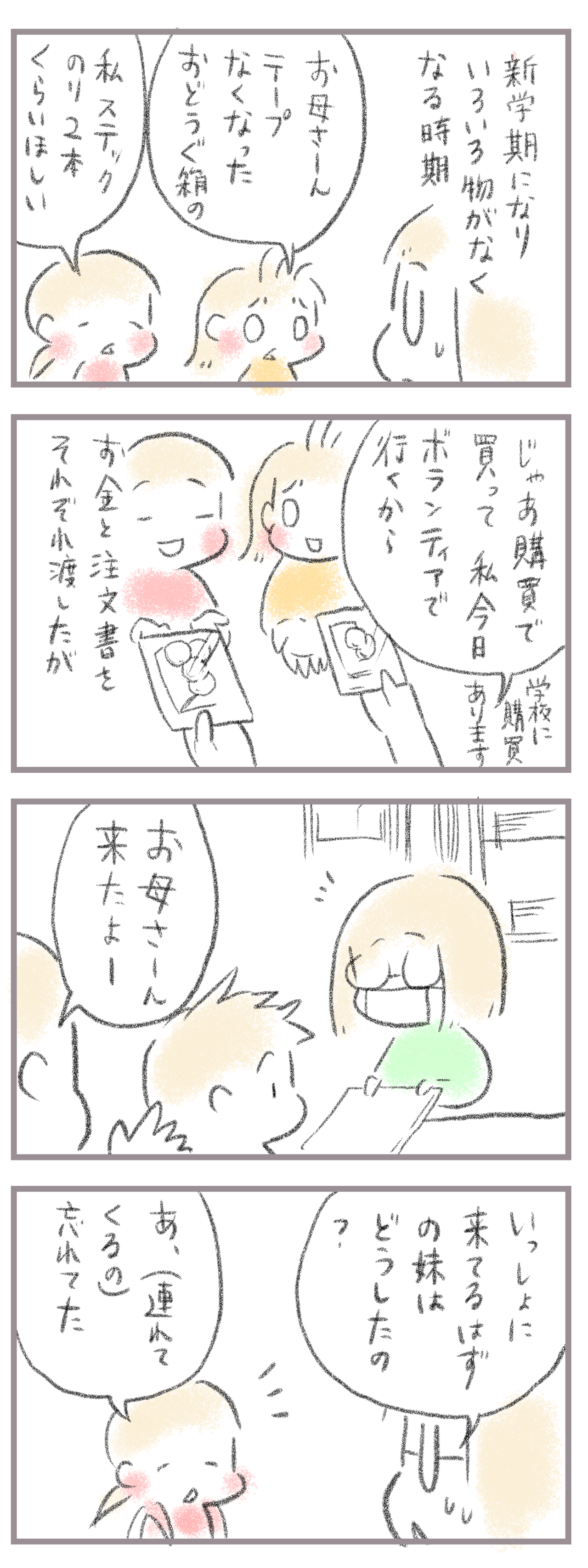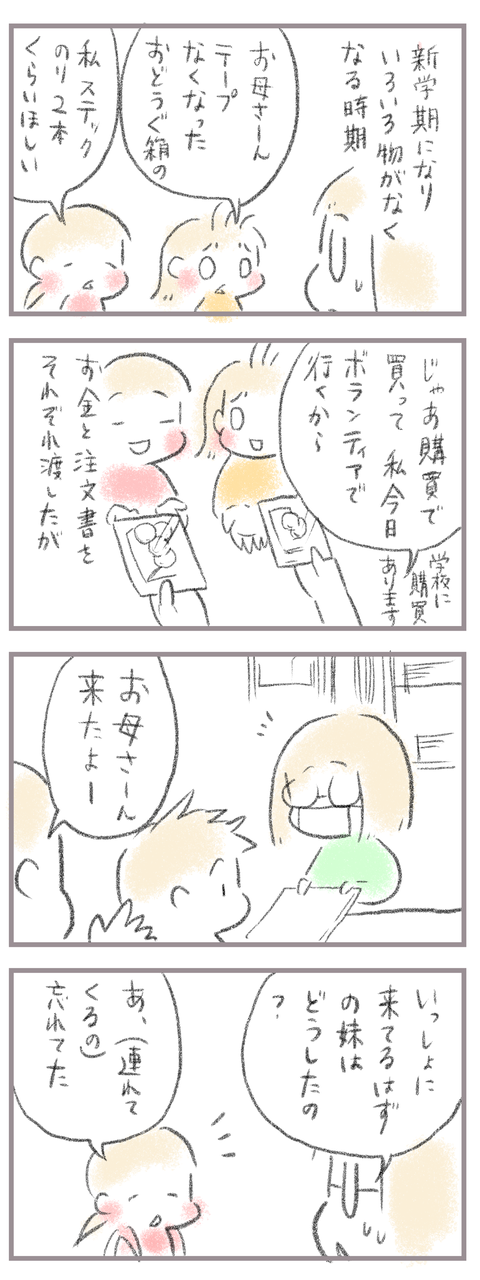 学校購買で見た姉妹関係・後編 2025年01月11日 来てくださってありがとうございます。9歳(小4)イチカと7歳(小1)ニコ、姉妹の母です。前回の続きで年明け一発目。姉妹で購買に行くはずでしたが…姉だけやってきた…なぜ?(前の記事↓) 小1のあるある…朝渡して、学校に先に出た母。その後色々やってて忘れたようで… ... 続きを読む 来てくださってありがとうございます。9歳(小4)イチカと7歳(小1)ニコ、姉妹の母です。前回の続きで年明け一発目。姉妹で購買に行くはずでしたが…姉だけやってきた…なぜ?(前の記事↓) 小1のあるある…朝渡して、学校に先に出た母。その後色々やってて忘れたようで…泣くしかない涙また購買の空いてる日を狙ってもって行ってもらいます。____________________姉妹ピアノインスタ作りました!長女のピアノ↓ 事情によりお子さんがピアノをやっている方のみの閲覧に変更しました次女のピアノ↓こちらはみなさん閲覧できる状態にしてます。あたらしい記事がアップされるとお知らせが届きます↓ ランキングに参加中よかったら一日一 回ぽちお願いします。にほんブログ村 タグ :#購買#姉妹関係#小1あるある