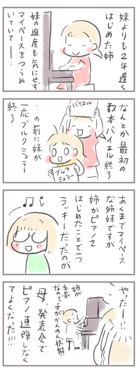 きてくださってありがとうございます。8歳(小3)イチカと6歳(年長)ニコ、姉妹の母です。 以前からちょろちょろピアノの発表会のことについて書いてましたが(連続で書けなくてすいません) 姉妹が言ってるピアノ教室は発表会が2年に一度で連弾と個人の2曲で出るのが決ま ...