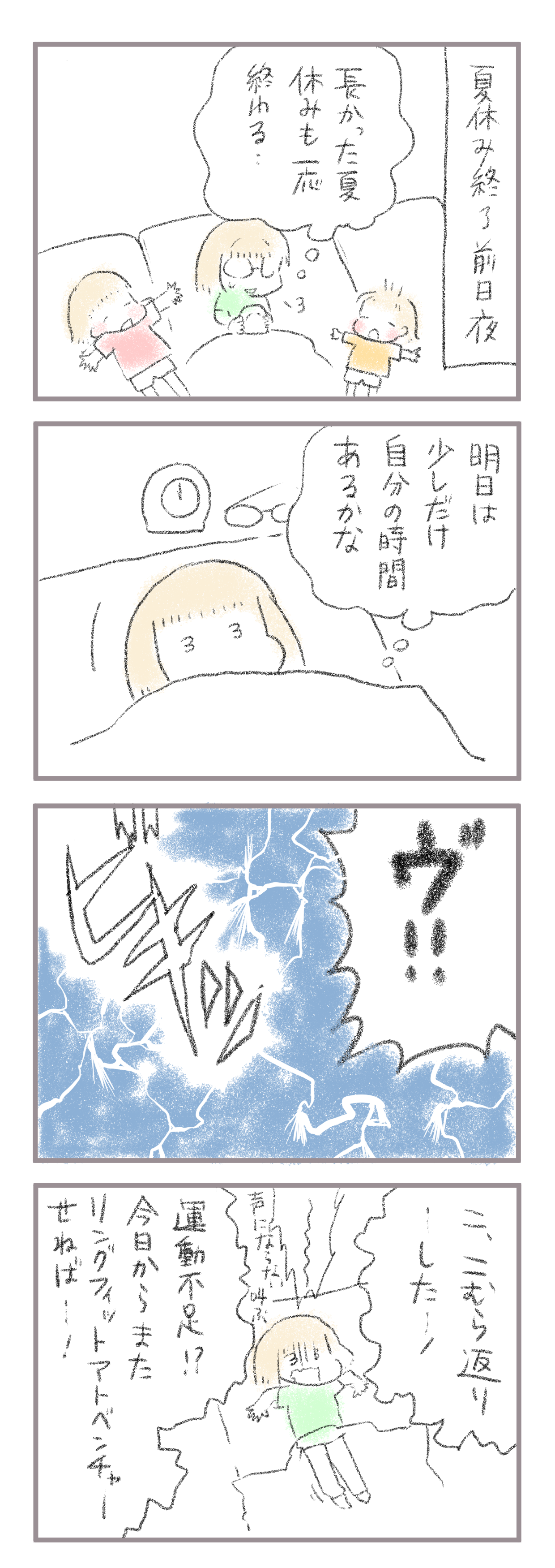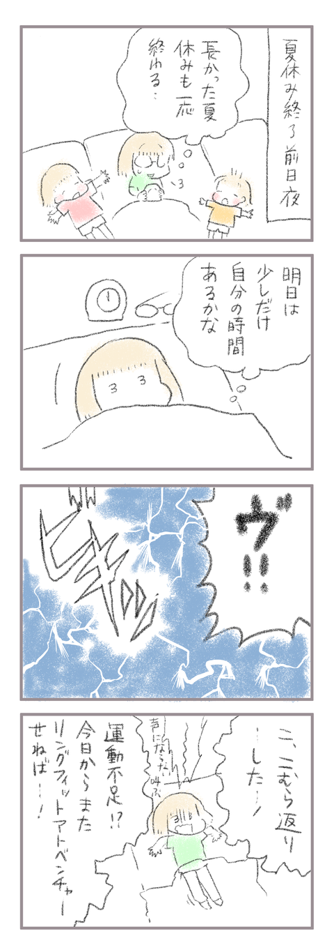 子供達が学校に行きだして母、必須になったこと 2021年09月02日 きてくださってありがとうございます。6歳(小1)イチカと4歳(年少)ニコ、姉妹の母です。 ここ何年となかったこむらがえりがまさかやってきました。これは…明らか運動不足。自粛だけではなくじっとしていたせいもあるのかな…汗動いてるようで動いてなかった んでしょう ... 続きを読む きてくださってありがとうございます。6歳(小1)イチカと4歳(年少)ニコ、姉妹の母です。 ここ何年となかったこむらがえりがまさかやってきました。これは…明らか運動不足。自粛だけではなくじっとしていたせいもあるのかな…汗動いてるようで動いてなかった んでしょう…涙ということでまた運動再開します…年取るって嫌だな;;___________ 出産妊娠記録まとめ長女妊娠出産記録→■次女妊娠切迫早産記録→■トイレトレーニングのお話→◾️______________インスタグラムお休み中です→■ランキングに参加中よかったら一日一回ぽちお願いします。 にほんブログ村 タグ :#運動不足#運動しないと…#40代の悩み