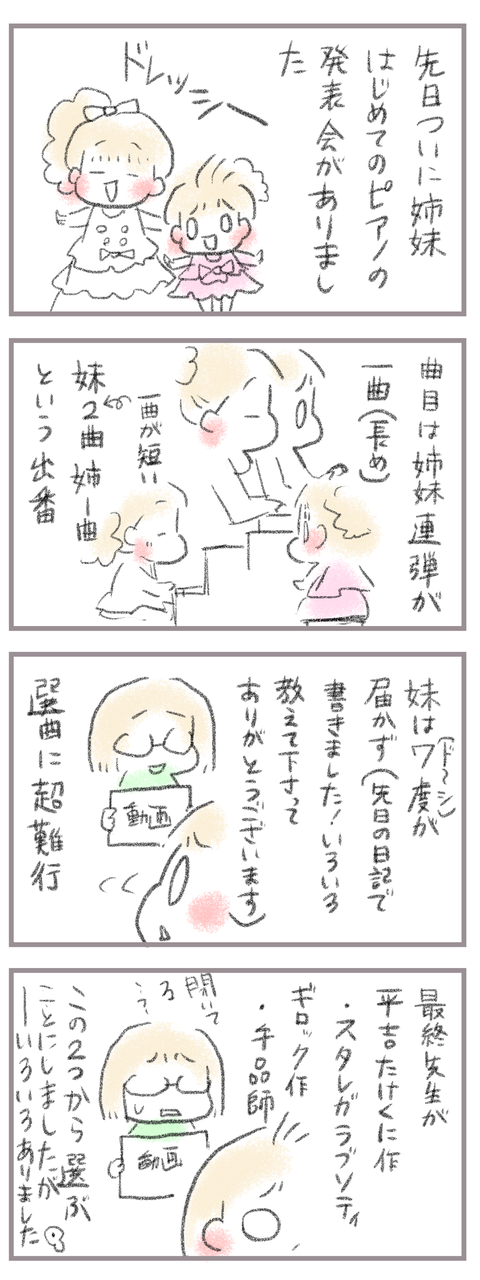 きてくださってありがとうございます。8歳(小3)イチカと5歳(年長)ニコ、姉妹の母です。ちょっと間が空きましたがイチカ、ニコ、2人の発表会のお話の続きです始めのお話↓ 次のお話↓ ちょうどその頃インスタなどを登録して見る時間が増えました。その影響がまさかの選 ...