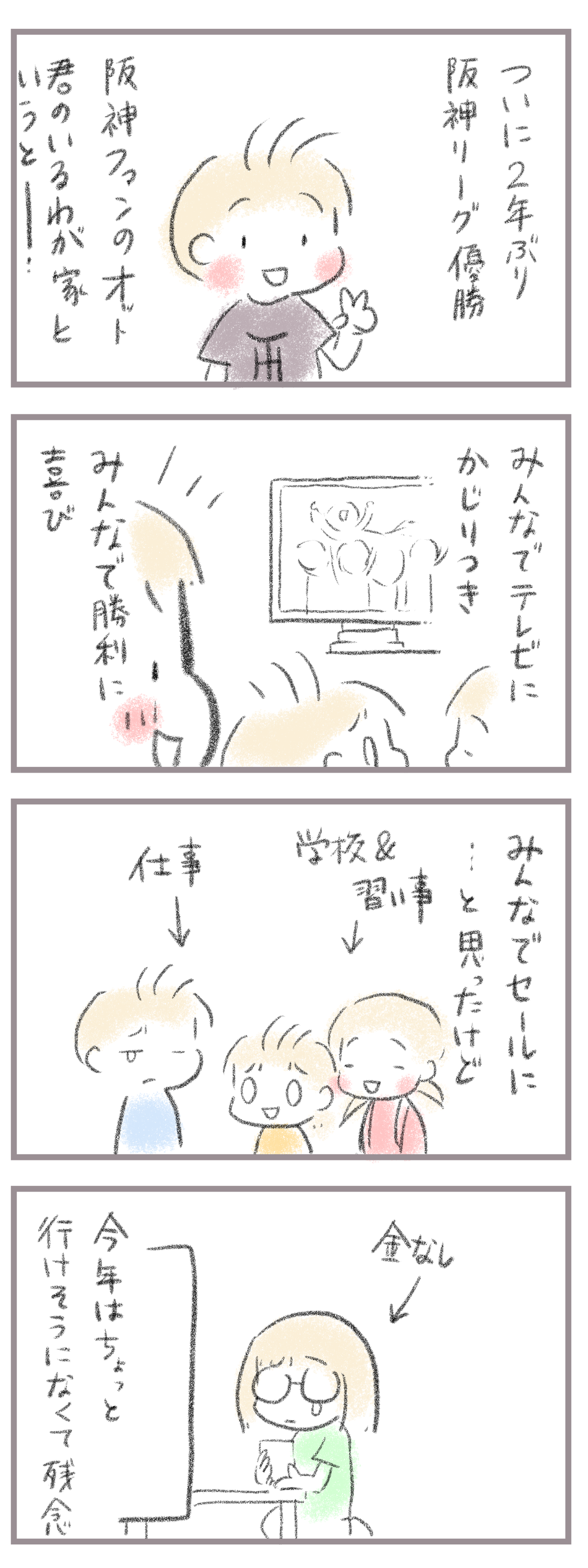 阪神リーグ優勝!阪神ファンのいる家は… 2025年09月08日 きてくださってありがとうございます。10歳(小5)イチカと8歳(小2)ニコ、姉妹の母です。阪神ファンのオットくんのいる我が家では相変わらず優勝の瞬間はみんなでテレビにかじりついてました。それは2年前と全く一緒w w w↓ でも2年前と違うのはセールに行けなかったこと涙 ... 続きを読む きてくださってありがとうございます。10歳(小5)イチカと8歳(小2)ニコ、姉妹の母です。阪神ファンのオットくんのいる我が家では相変わらず優勝の瞬間はみんなでテレビにかじりついてました。それは2年前と全く一緒w w w↓ でも2年前と違うのはセールに行けなかったこと涙↓ 色々ちょっと貧しくなっていけなくなっちゃったけど阪神タイガースおめでとうございます!____________________姉妹ピアノインスタ作りました!長女のピアノ↓ 事情によりお子さんがピアノをやっている方のみの閲覧に変更しました次女のピアノ↓こちらはみなさん閲覧できる状態にしてます。あたらしい記事がアップされるとお知らせが届きます↓ ランキングに参加中よかったら一日一 回ぽちお願いします。にほんブログ村 タグ :#阪神タイガース#優勝#セール行きたかったな